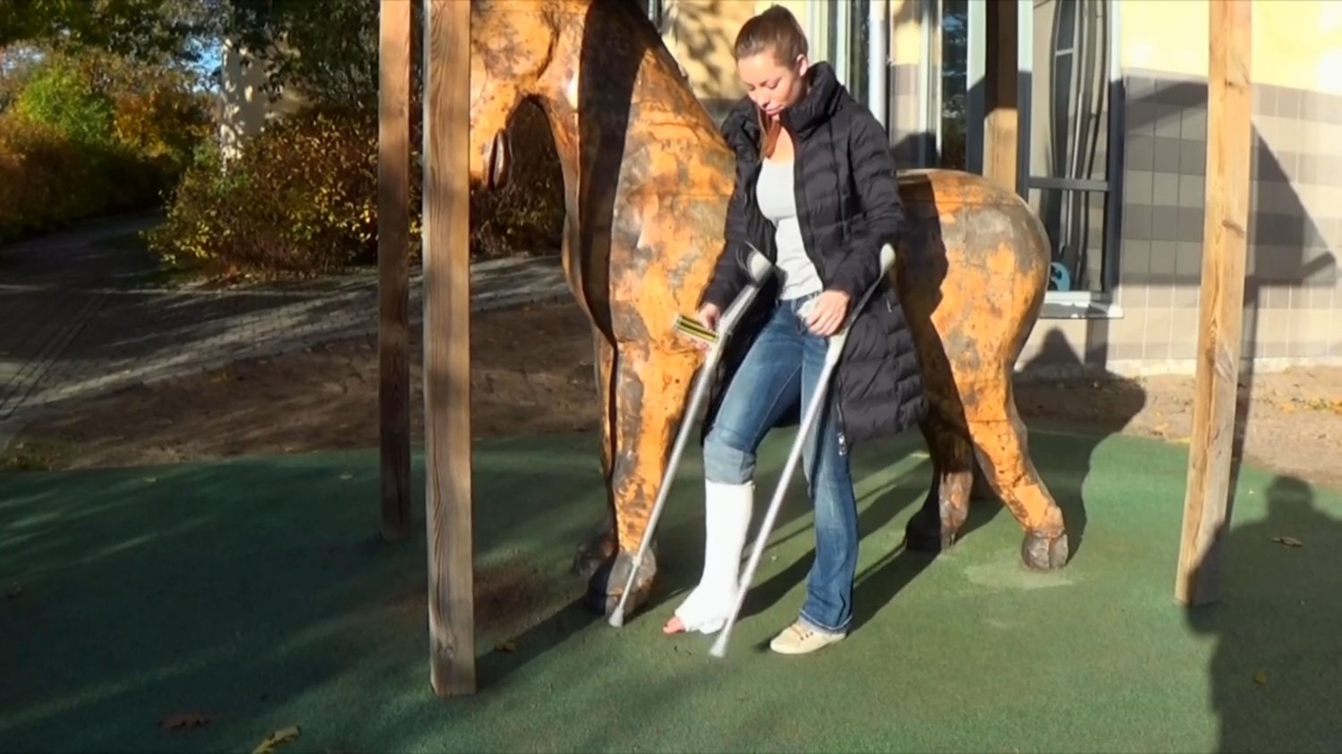 This clip starts with a extreme closeup of Melindas toes when she wiggling them for us.She crutch away down the street and we get some better look at her cast when she rest and put her SLWC up on a crutch.This clip include a lot of great crutching and lots of closeups.