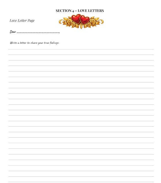 Pages for love letters, drawing, writing, and fun ideas.