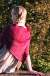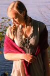 Construction: this shawl is provisionally cast on at the center vertical, and each half of the central triangle is worked in short rows to the side. The chevron edging may be customized to be wider or narrower, depending on your preference and available yardage.