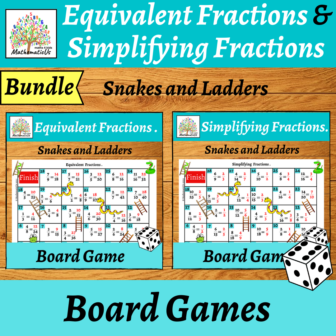 There are 2 Snakes and Ladders Dice Games for practice with Equivalent Fractions and Simplifying Fractions. Each game was designed to engage student practice more. Those games make learning Equivalent and Simplifying Fractions fun and easy for students. Great for classwork, homework, additional practice, and early finishers.