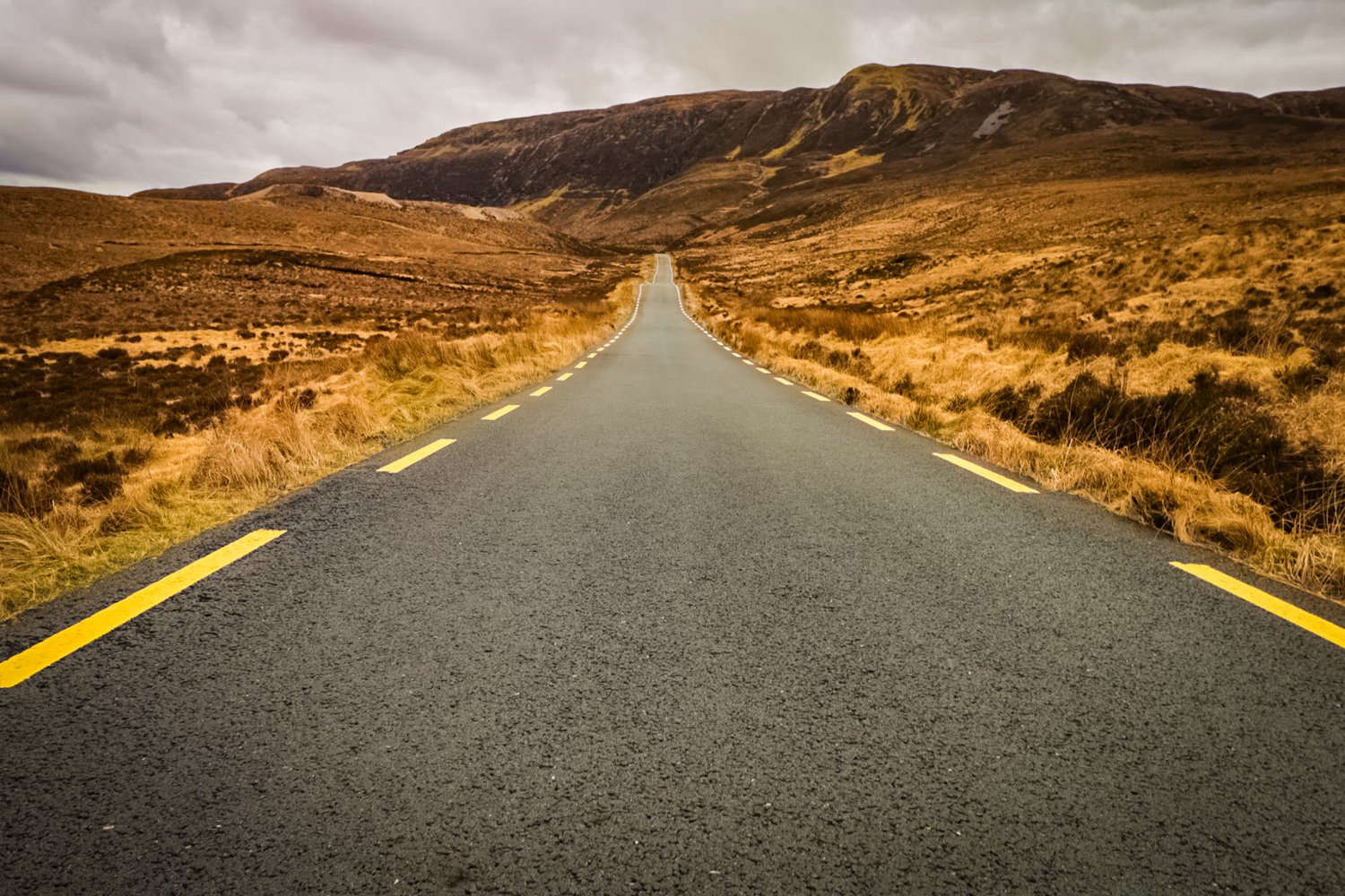 A quiet road stretches forward through open Donegal hills, drawing the eye into the landscape beyond. A simple, evocative image that speaks to freedom, movement, and unhurried journeys.