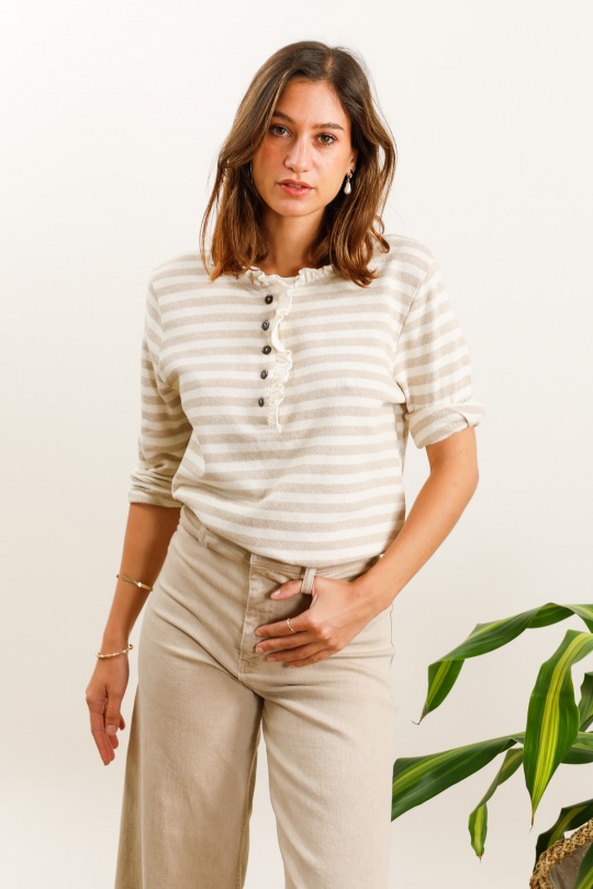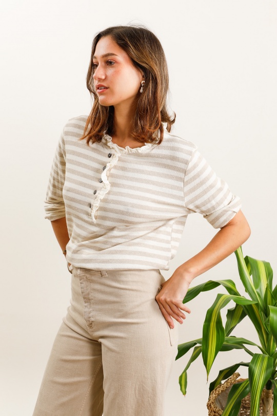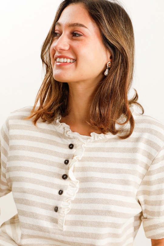 Classique mais toujours tendance, il séduit par ses rayures intemporelles et sa coupe confortable. En coton doux et légèrement stretch, il s’adapte parfaitement à ta silhouette tout en assurant un confort absolu au quotidien 🤍