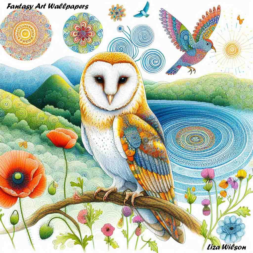 Beautiful spirograph Barn Owl on a branch with humming birds, mountains, flowers, and a lake. Spirograph style patterns.
