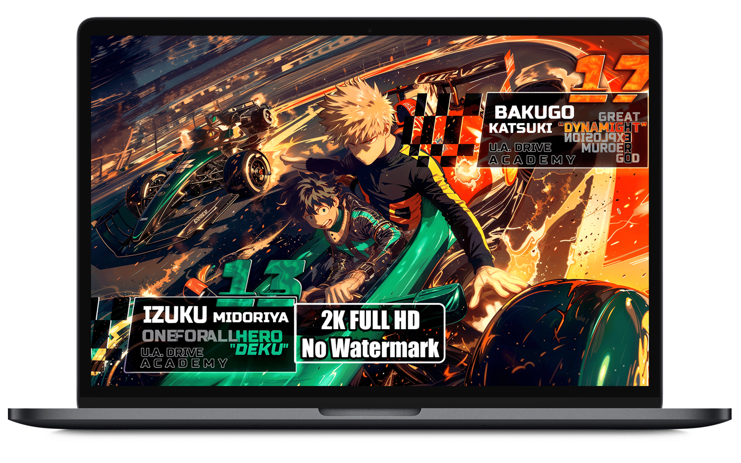 Join Izuku Midoriya and Katsuki Bakugou as they push their prototype racer to the limit in this adrenaline‑charged Formula 1 crossover scene. The pair race side‑by‑side through blazing sparks and debris, capturing the explosive rivalry between the aspiring heroes.
