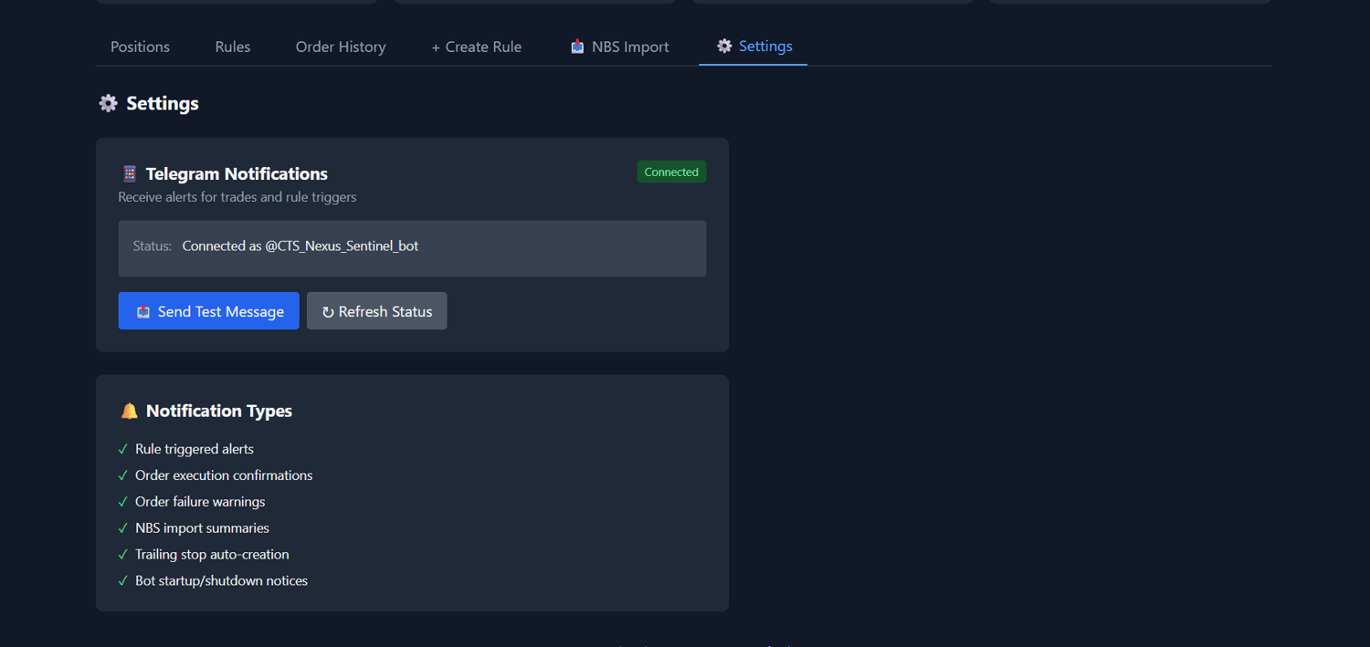 FeatureWhat You SeeCash AvailableFree funds in your accountPositionsHoldings with live values and P/LRulesAll active buy entries and trailing stopsActivityReal-time scan log proving Sentinel is workingCompany NamesNot just tickers — see what you actually own
