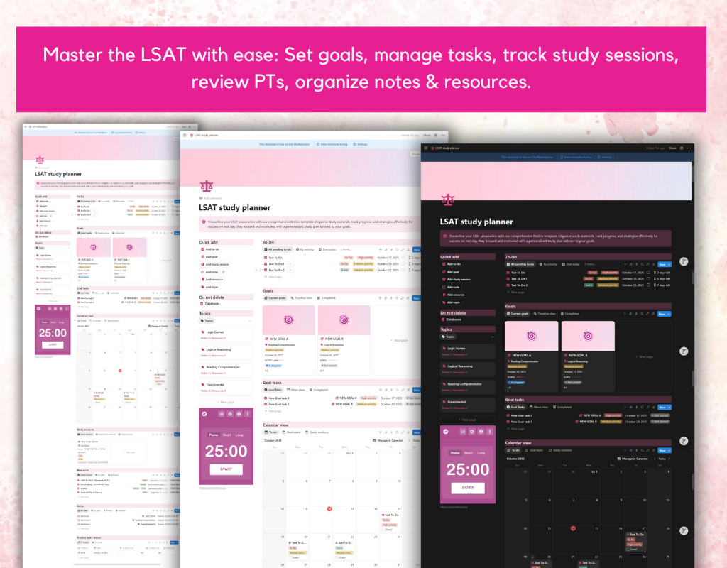 Welcome to LSAT Study Planner in Notion! Designed to empower your LSAT preparation journey, this comprehensive template offers a suite of features tailored to optimize your study process and maximize your success.