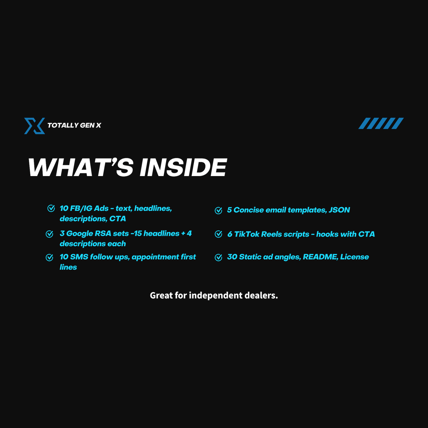 What's inside: Every channel covered. Every file dealer-ready. Replace the {{placeholders}} with your real values and you're live in under an hour.