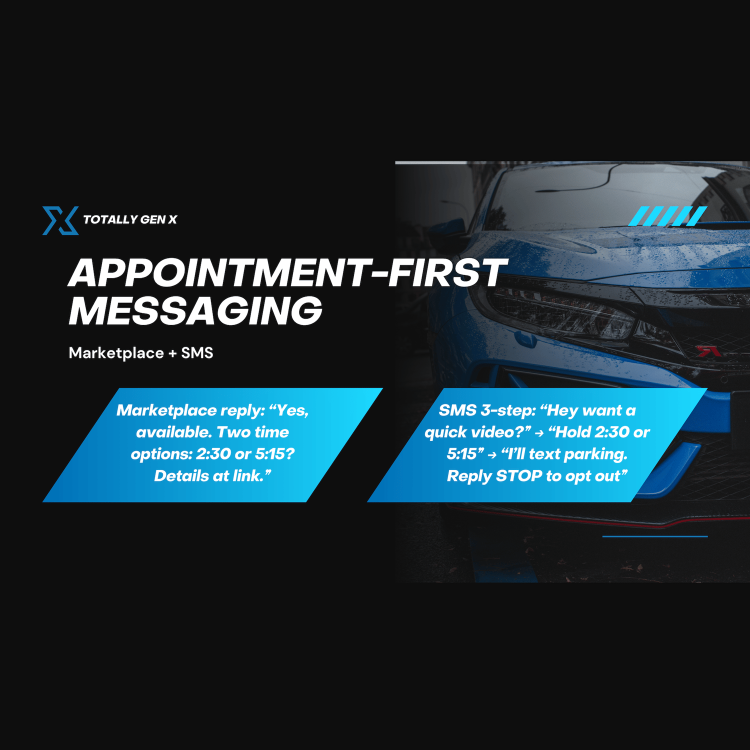 - Email Templates (5) — concise follow-up emails for vehicle inquiries, trade-in leads, appointment scheduling, inventory updates, and pre-qual