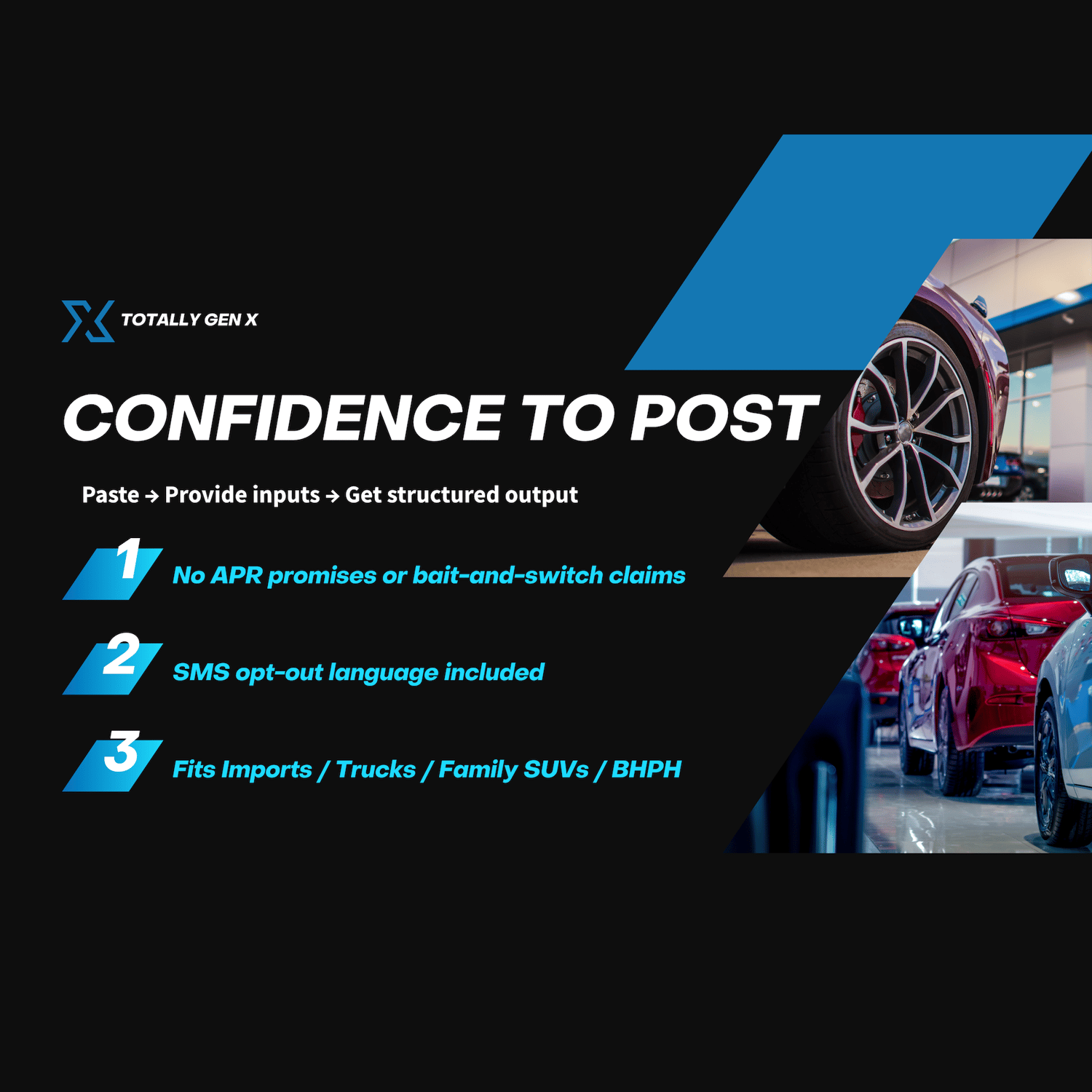 Built for independent dealers: Imports, trucks, family SUVs, BHPH. EN/ES friendly language throughout. Compliance cues on every file — no APR promises, no guaranteed approval language, SMS opt-out included.