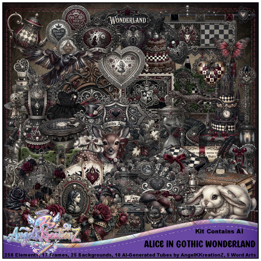 Step into a hauntingly beautiful twist on a beloved fantasy with Alice in Gothic Wonderland, a dark storybook digital scrap kit inspired by gothic elegance, vintage tea parties, enchanted clocks, checkerboard whimsy, black roses, playing cards, potion bottles, lace, and eerie Wonderland charm. This collection blends soft feminine details with moody gothic flair, featuring ornate accessories, mysterious curiosities, whimsical fantasy accents, and semi-realistic characters dressed in dark Wonderland fashion.