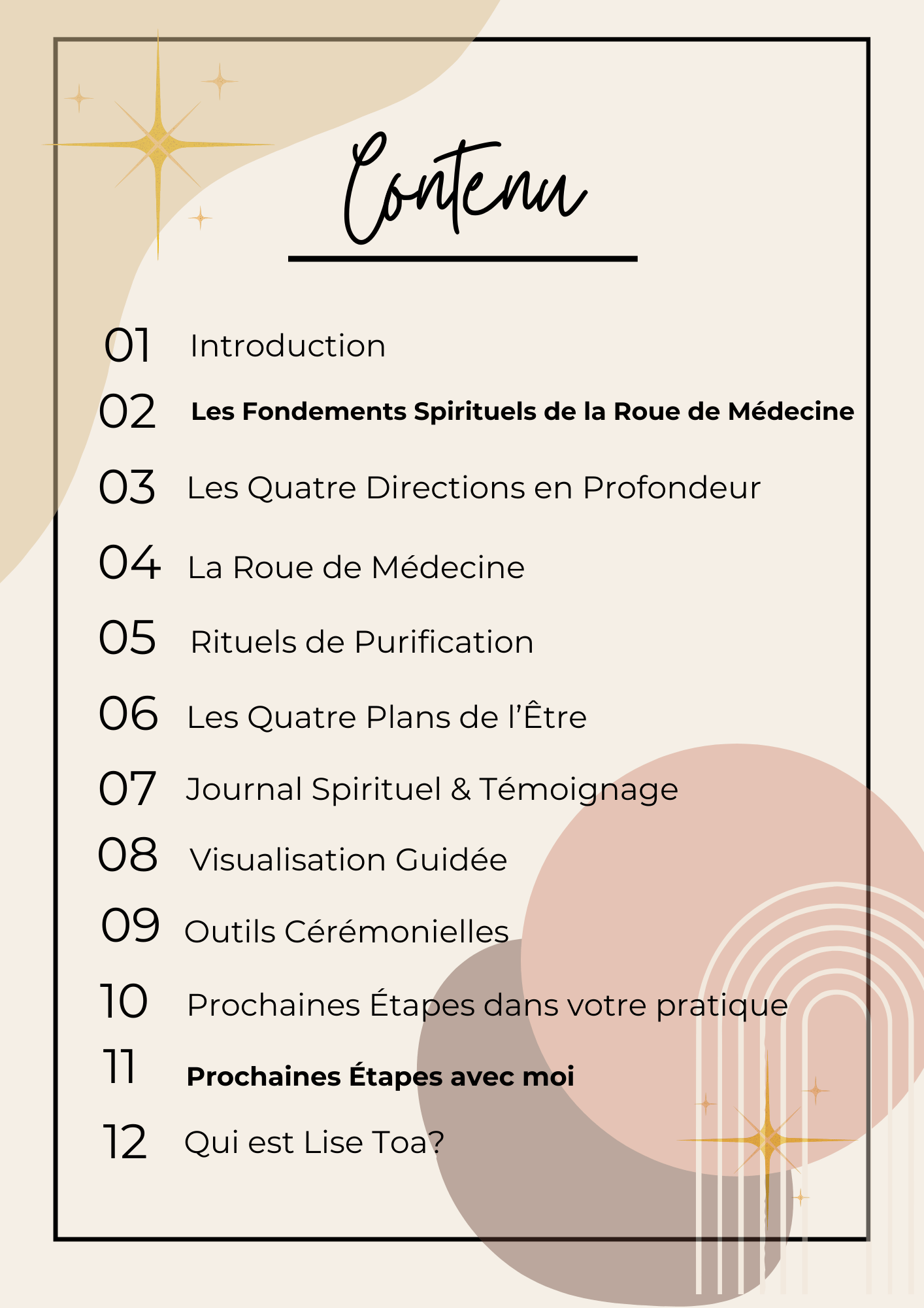 Ce guide de 80 pages, richement illustré, vous accompagne pas à pas pour comprendre, intégrer et activer les enseignements sacrés de la Roue de Médecine.