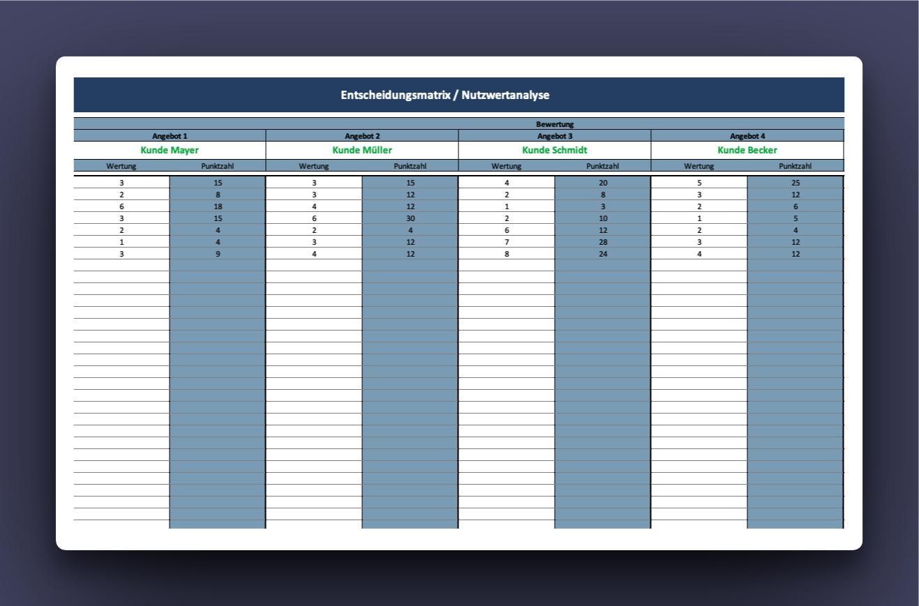 In dieser offen editierbaren Excel-Datei findest du eine praxisbewährte Nutzwertanalyse + Entscheidungsmatrix.