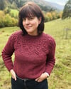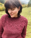 It’s knitted in one piece, starting with the neckline. The yoke is adorned with a pattern combining lace and cables, which is reminiscent of the lines of a bouquet.