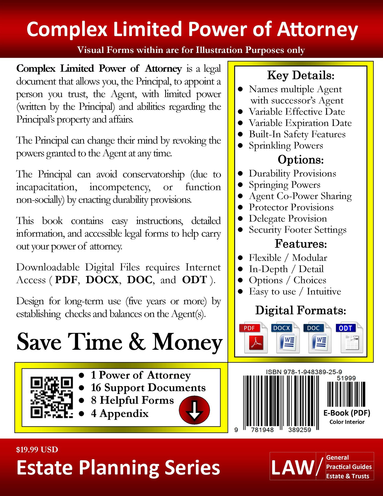 The book consists of (01) one Complex Power of Attorney (the Principal writes the provisions concerning the Agent's powers), (16) sixteen Supporting Documents, (05) five Miscellaneous Forms, (03) three Recommended Forms, and (04) four Appendixes. This Power of Attorney has an estate planning focus that provides options, depth, and flexibility while maintaining uniformity with built-in and optional safety features.