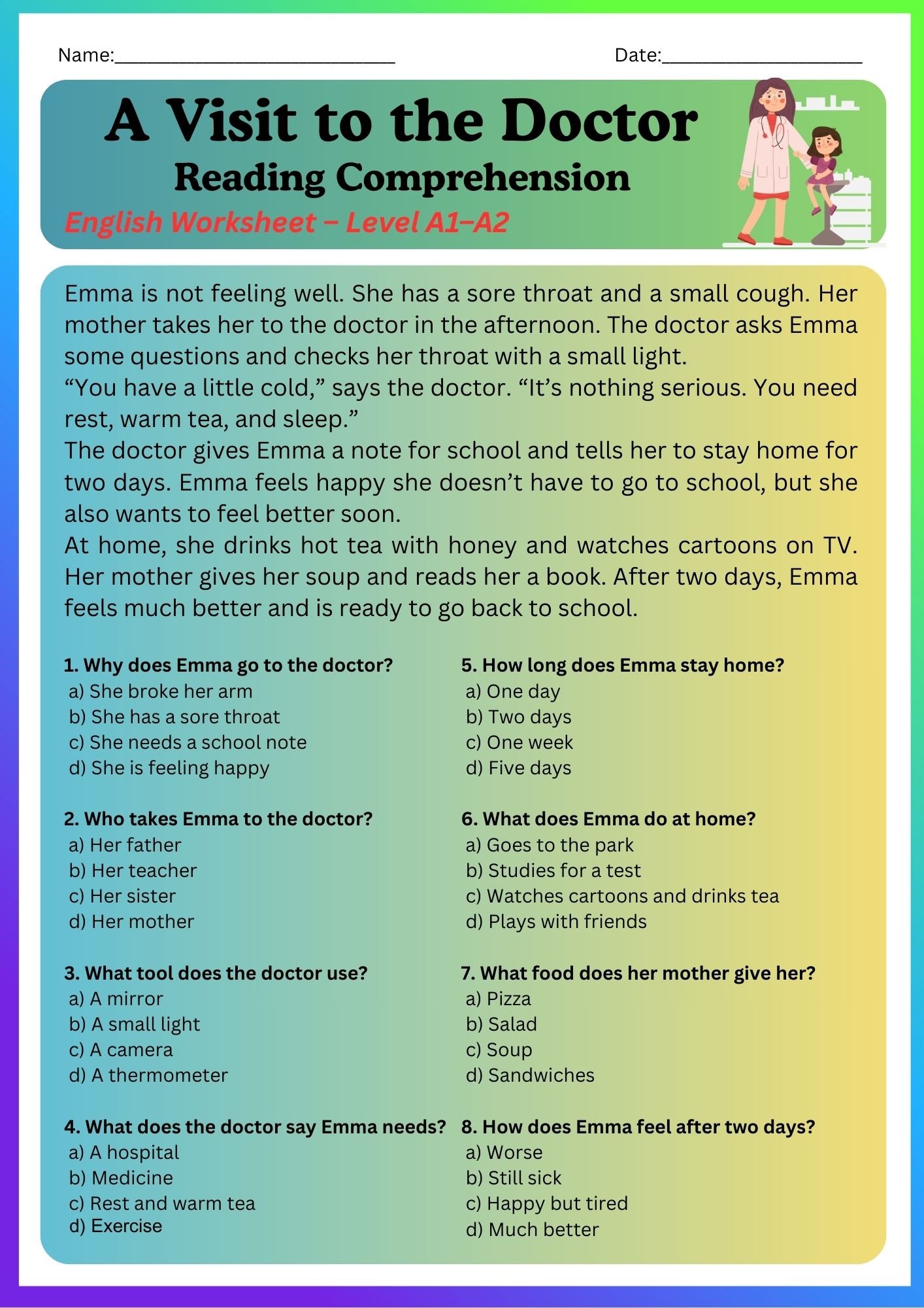 This engaging reading comprehension worksheet is designed for beginner English learners (CEFR levels A1–A2). The short story follows Emma, a young girl who visits the doctor with a sore throat. Learners will enjoy reading the simple, relatable text and answering 8 multiple-choice questions to check understanding.