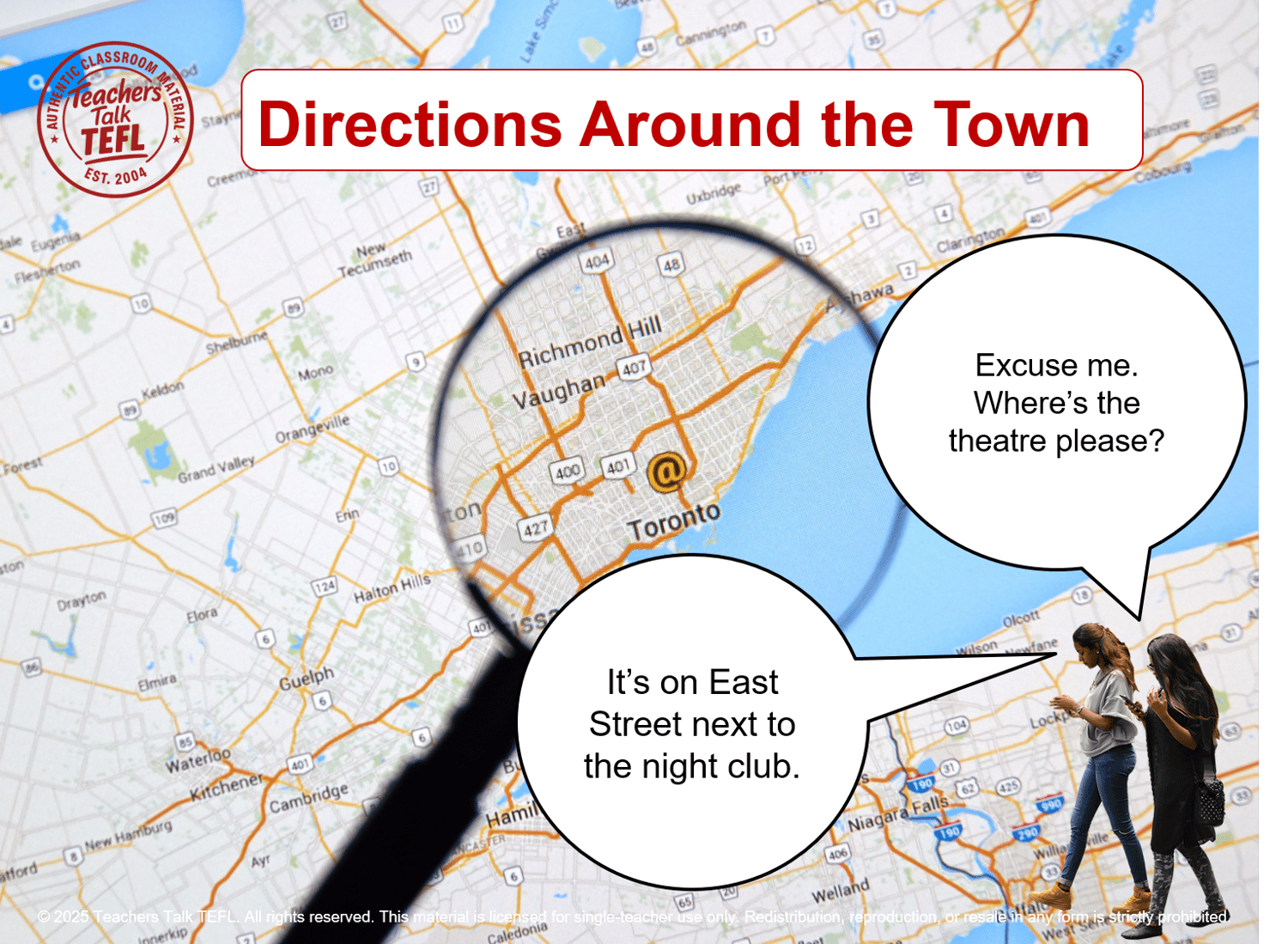 Teach your students how to ask for and give directions with confidence. This lesson builds real-world fluency using maps, places in town, and structured roleplays.