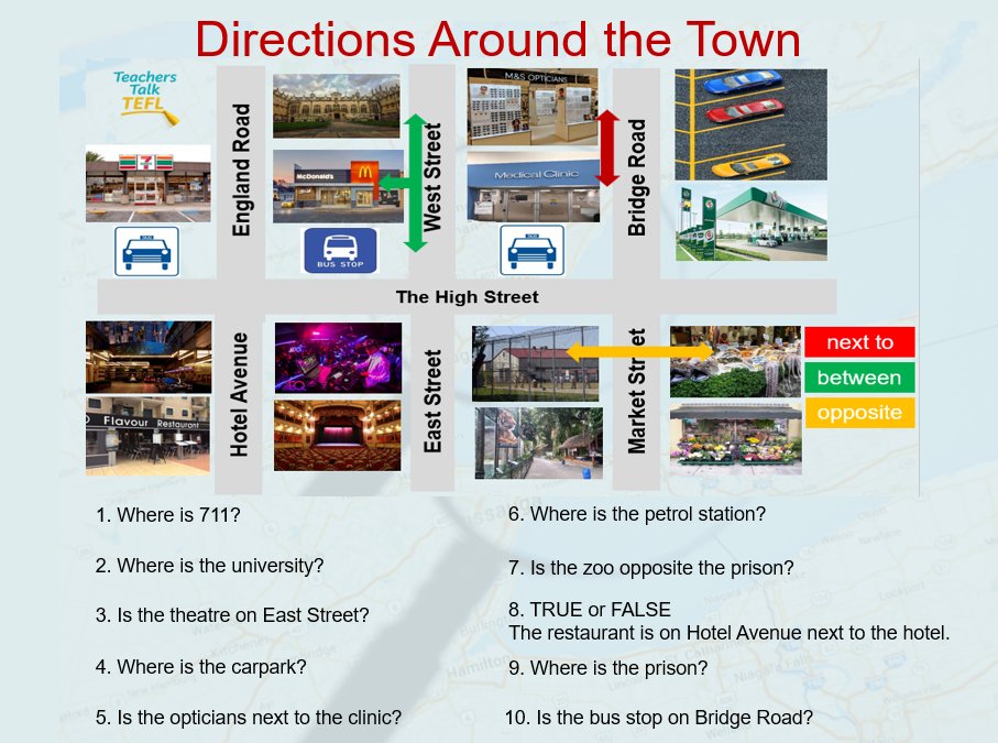 - Vocabulary: directions (left, right, opposite, between), public places (zoo, theatre, clinic, night club, florist, prison)