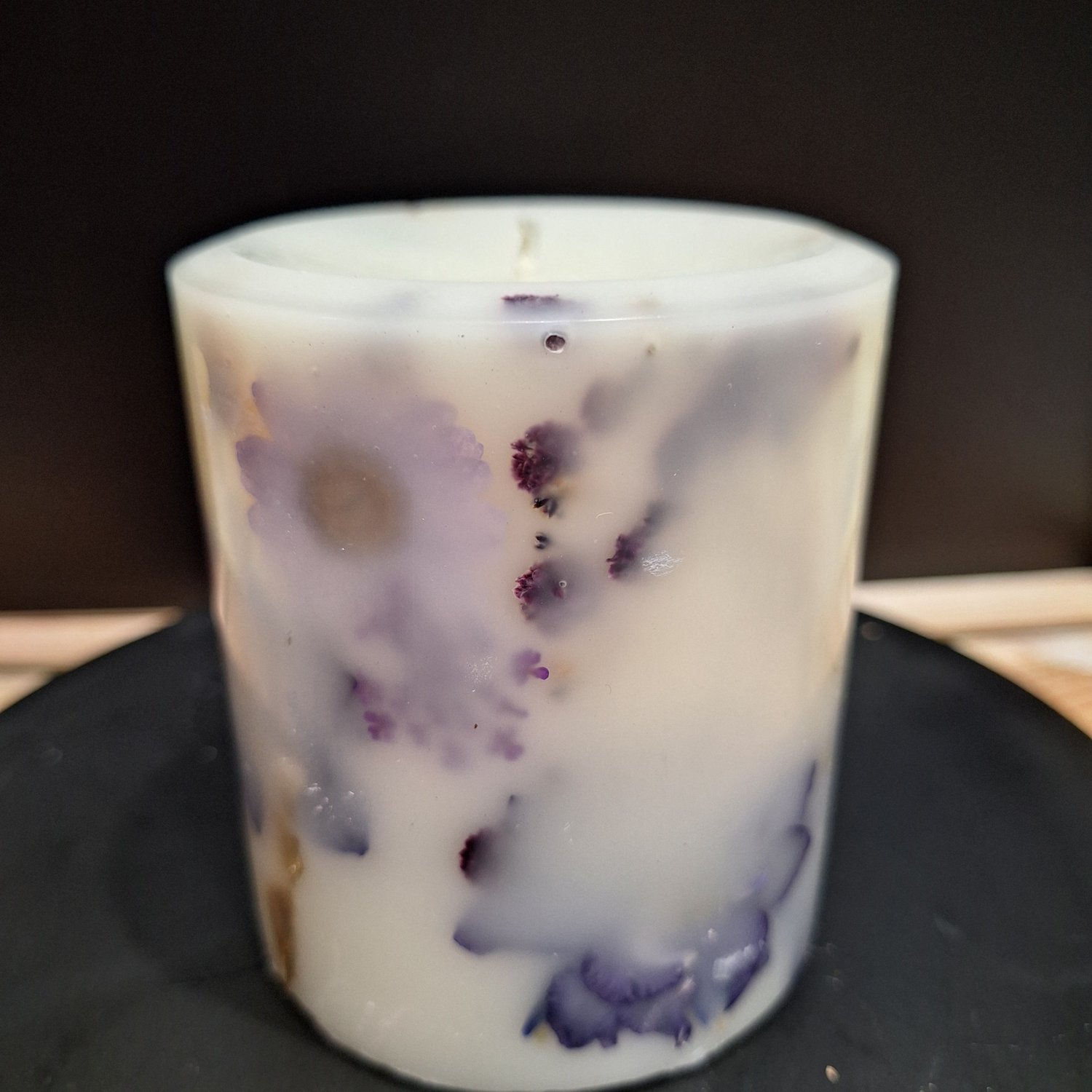 There are dried flower components in the wax, which means this is a decorative candle only and should not be burned.