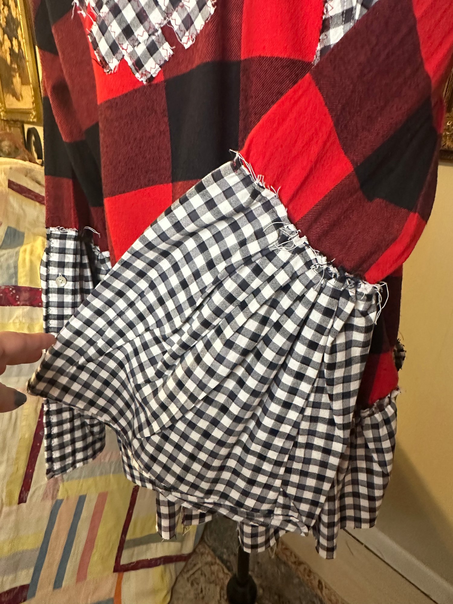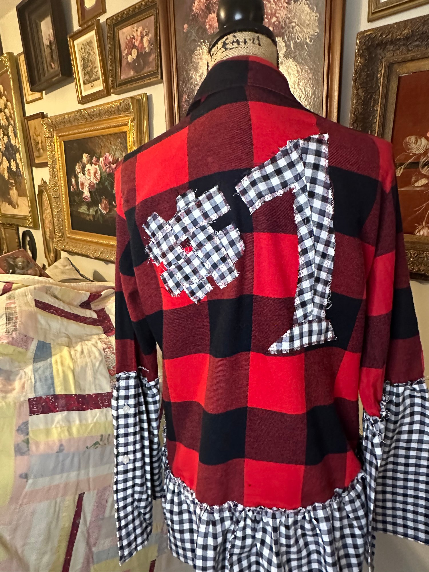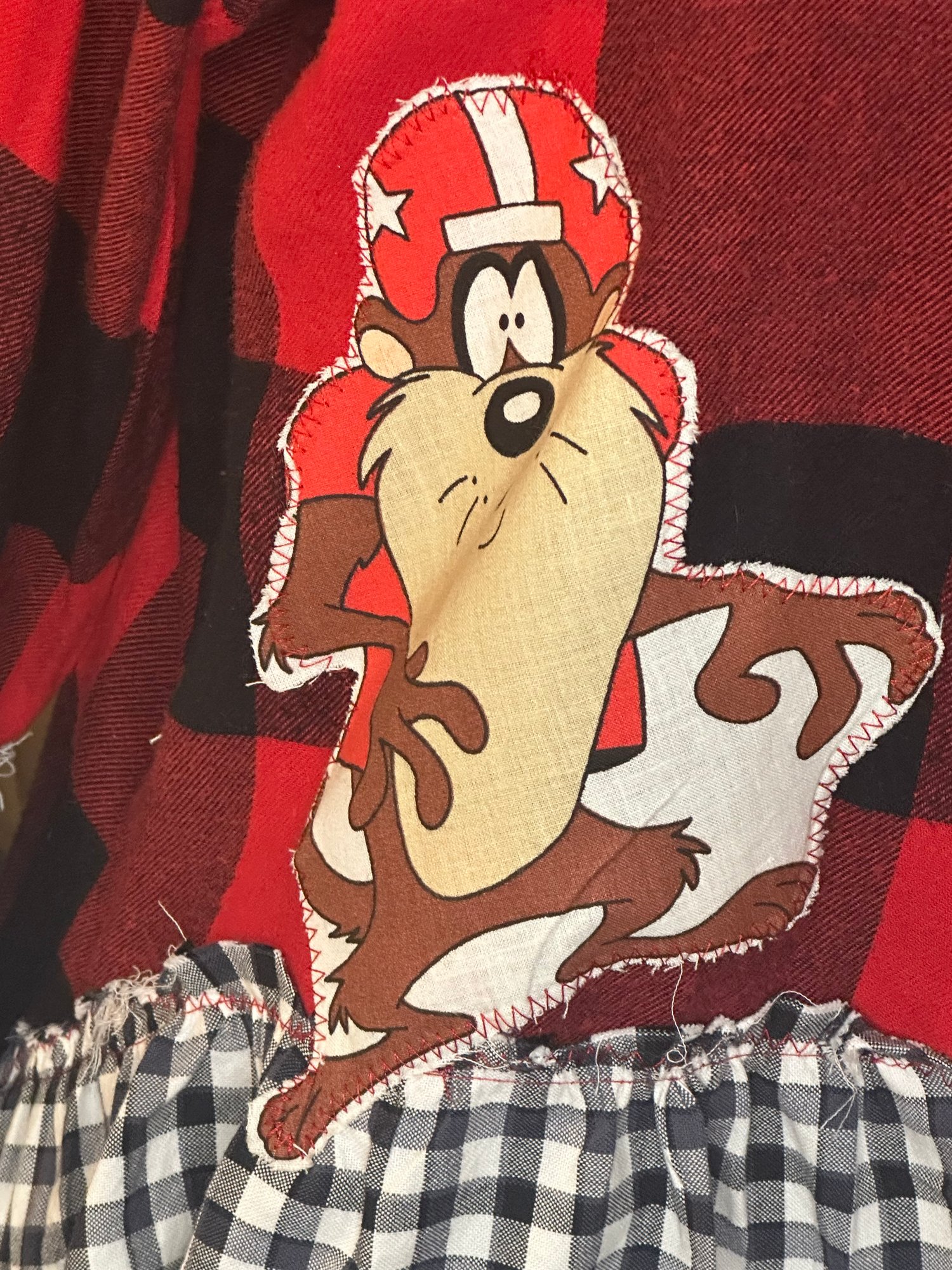 This one-of-a-kind cropped flannel is where cozy meets playful! Made from a bold red-and-black buffalo check shirt, it’s reimagined with black-and-white gingham ruffle bell sleeves and a cropped hemline for a feminine, statement look. On the front, a vintage-style Looney Tunes Taz football patch adds a touch of sporty nostalgia, while raw edge details and mixed plaid patchwork give it that perfectly distressed, handmade vibe.