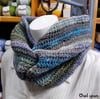 Featherbone Crochet Cowl is a squishy and drapey cowl with striking twist detail. This cowl features an engagingly unique crochet stitch with a simple construction. A matching cowl to the Owl Spun Featherbone Shrug!