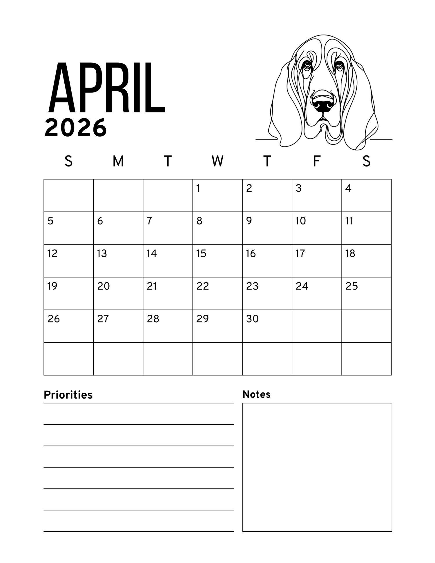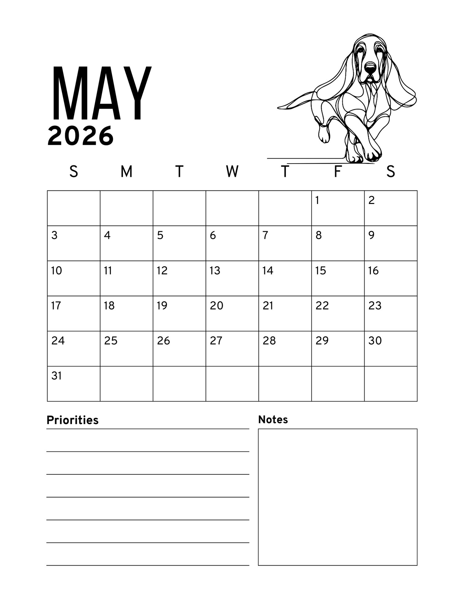 2026 CUTE BASSETS PRINTABLE CALENDAR