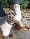 The tree and lower part are worked in cables, the stars are made up of estonian star stitch and the main leg is worked in 2x2 ribbing for a nice snug fit.