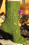 These intricate socks combine lace, travelling cables and twisted stitches to create a complex design suggesting trailing vines and twisted tendrils. The pattern provides detailed instructions and numerous charts. The left and right socks are partial mirror images of each other. These socks are worked from the top down.