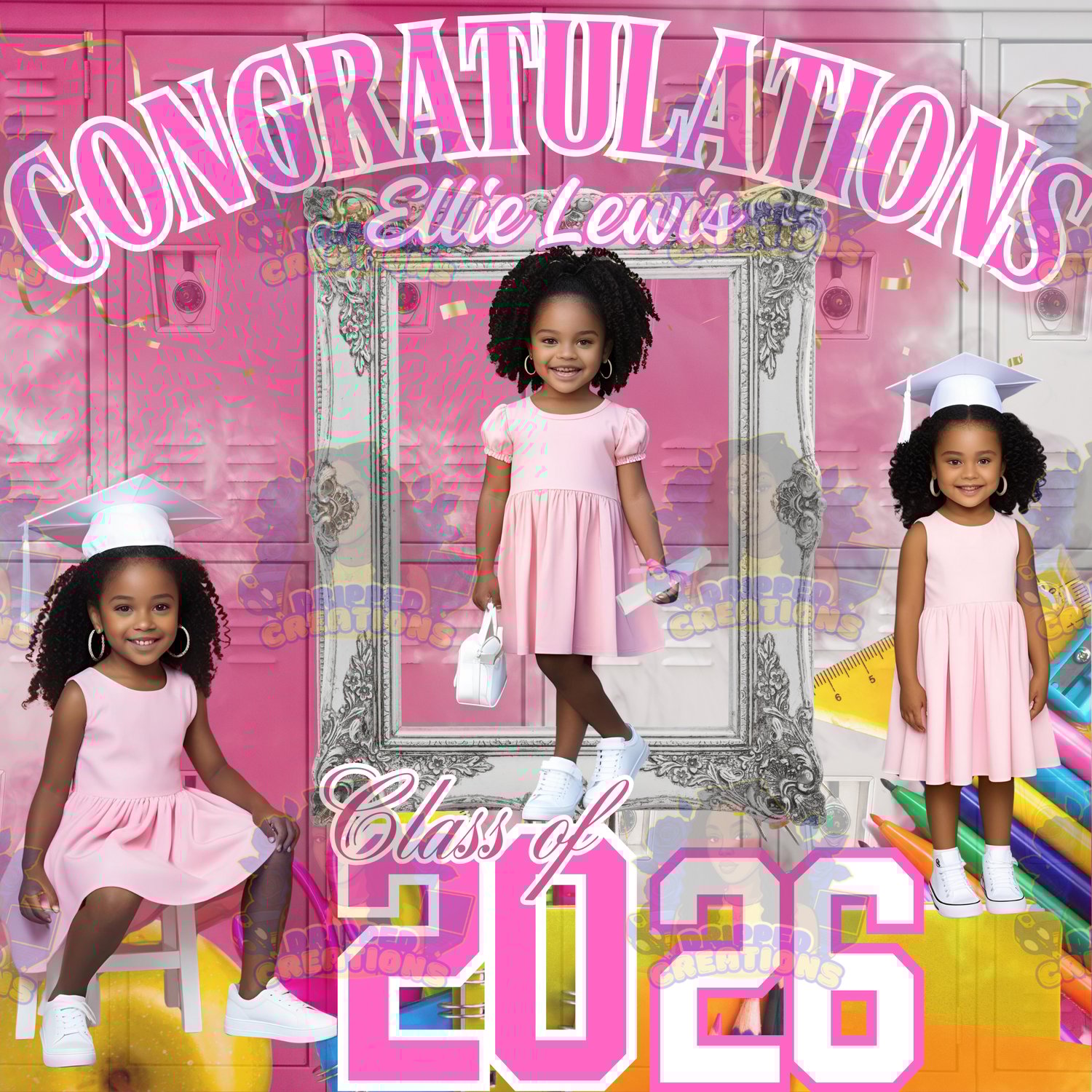 Layered design with graduation-themed graphics (caps, diplomas, confetti, etc.)