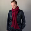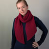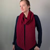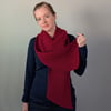 The pattern includes an option for a bias scarf, shown in red, which has increases at the start and decreases at the end of every RS row, or a regular scarf, shown in grey. It includes instructions for both DK and Worsted weight yarns in both versions.