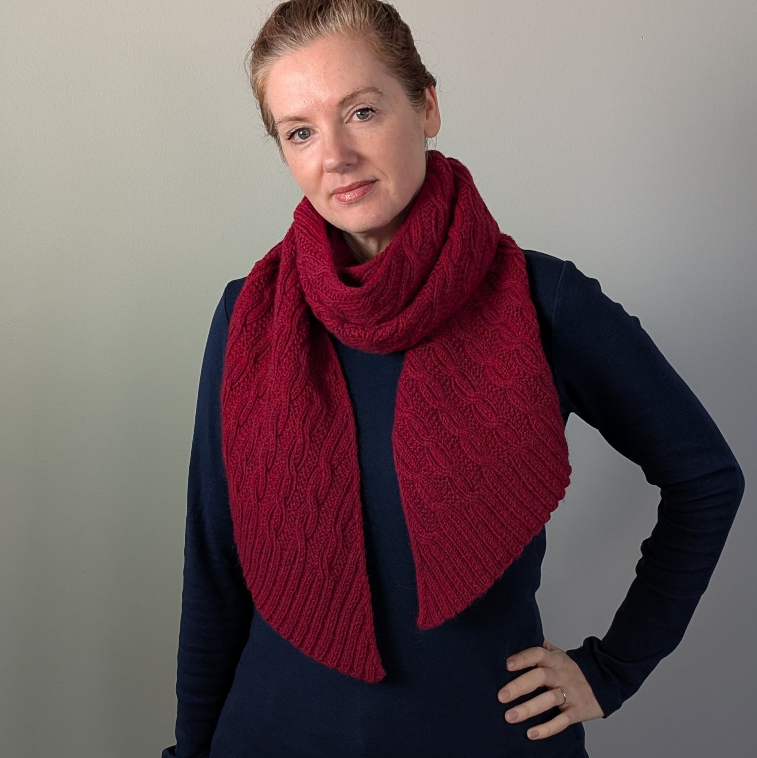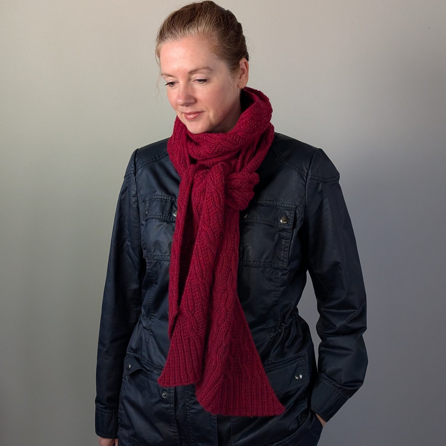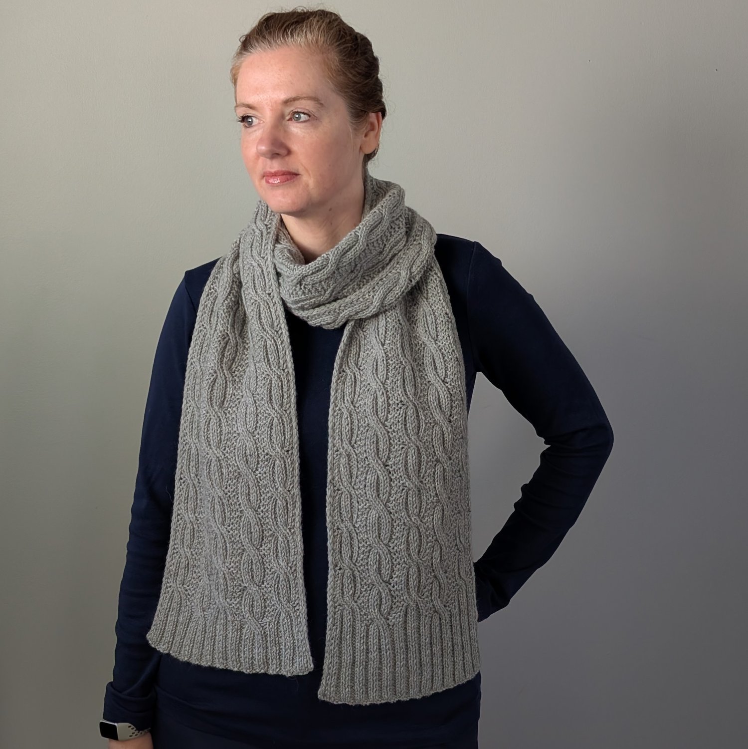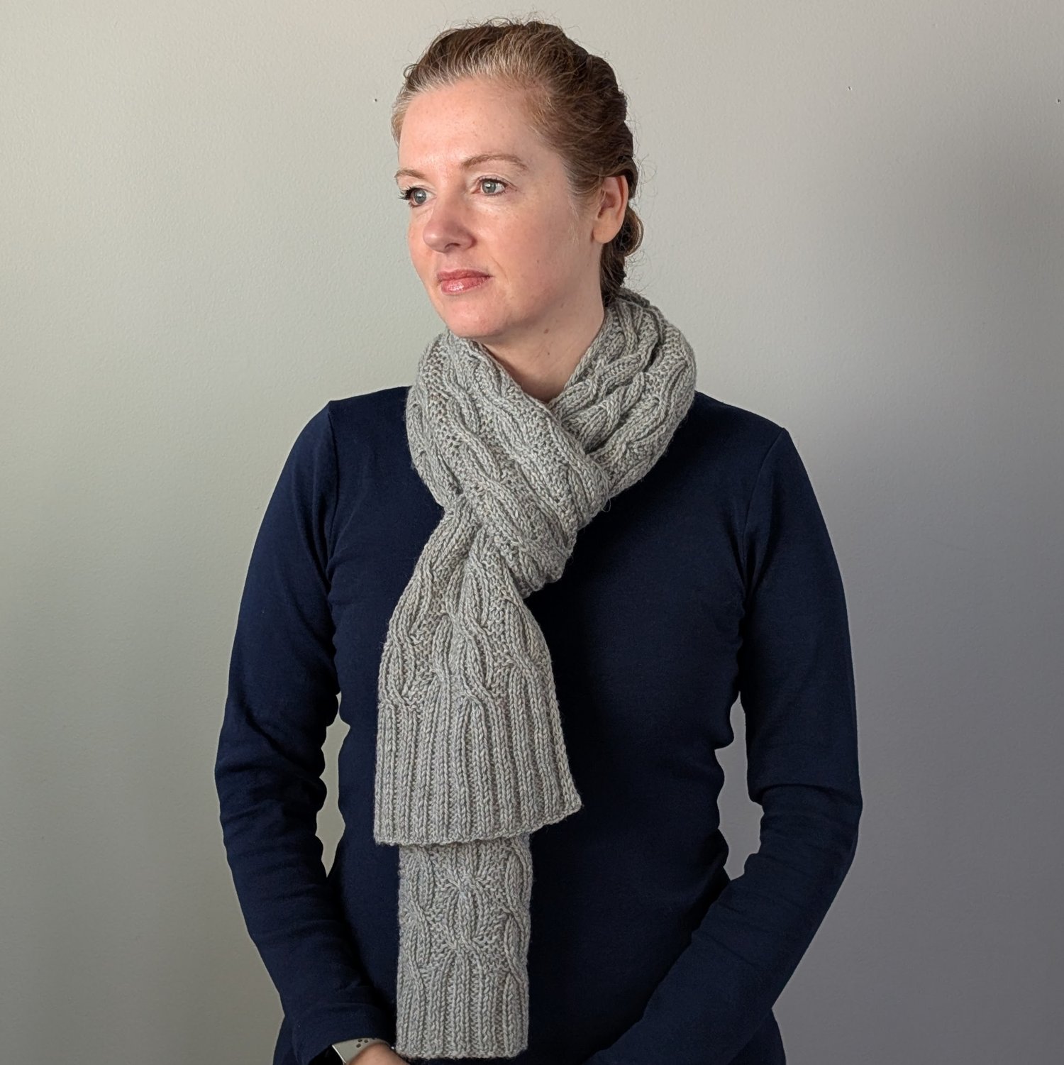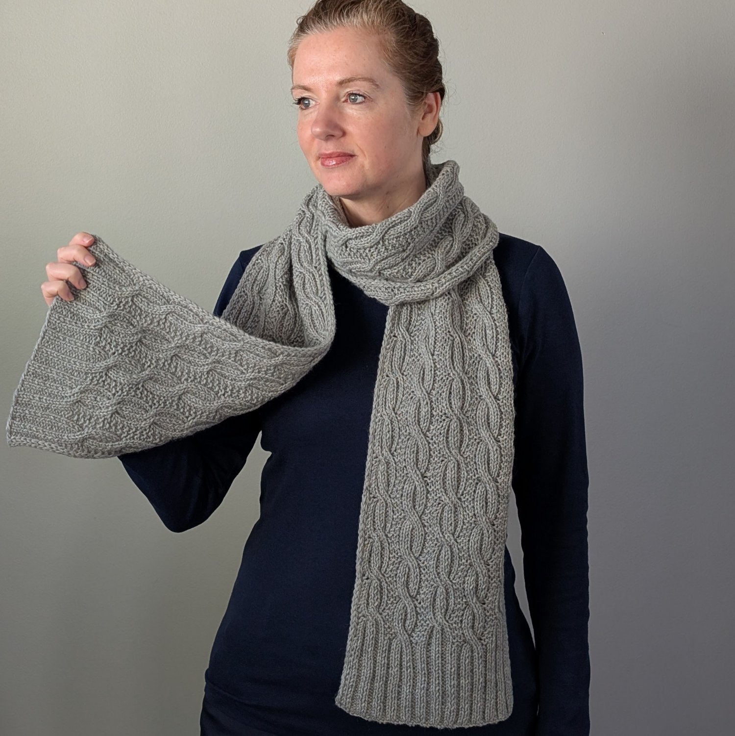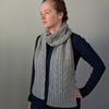 The scarf is knit flat from end to end with i-cord edging on both sides. It starts and ends with 2x2 ribbing, and features a reversible cable pattern in between.