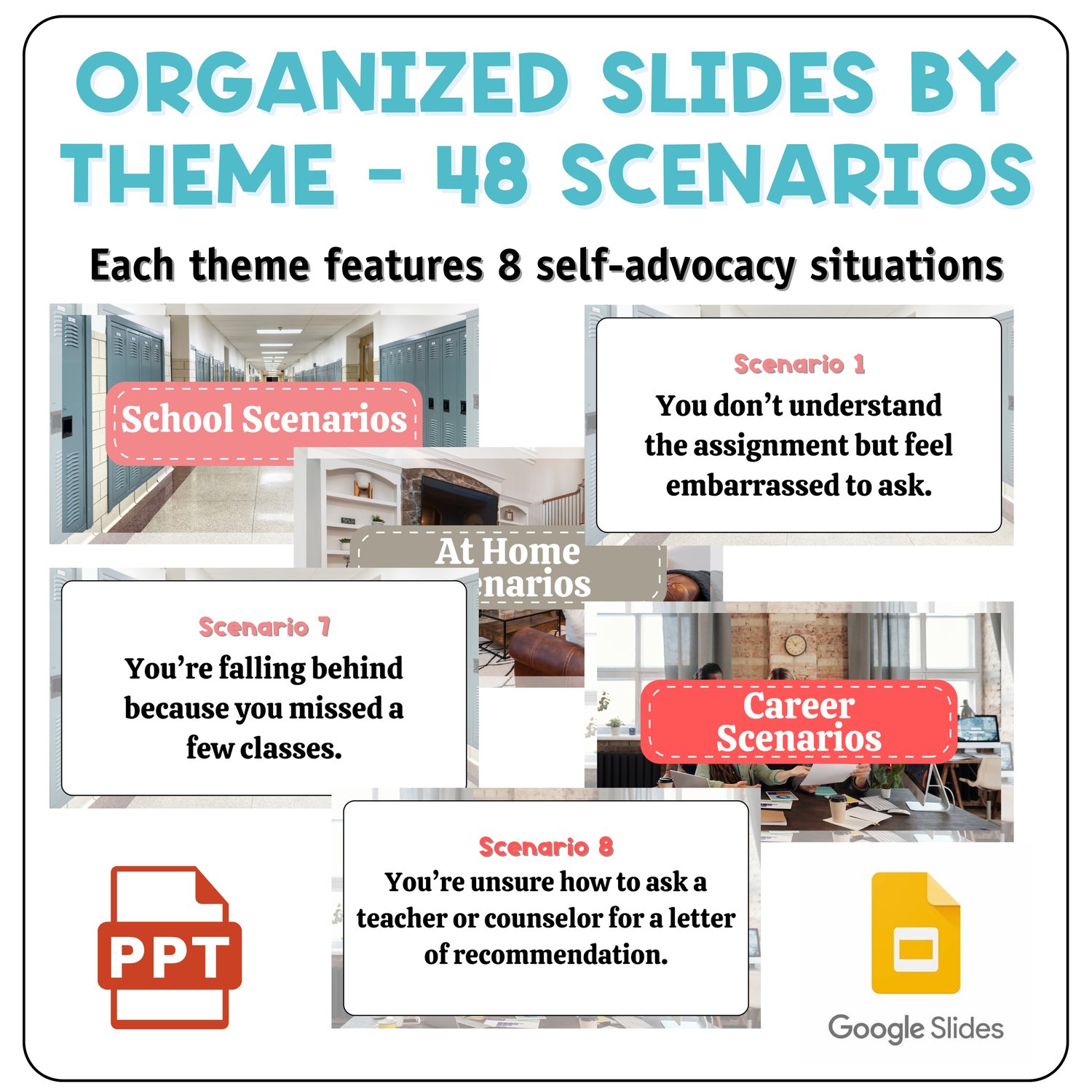 - One slide per scenario for classroom discussions, SEL lessons, or group activities