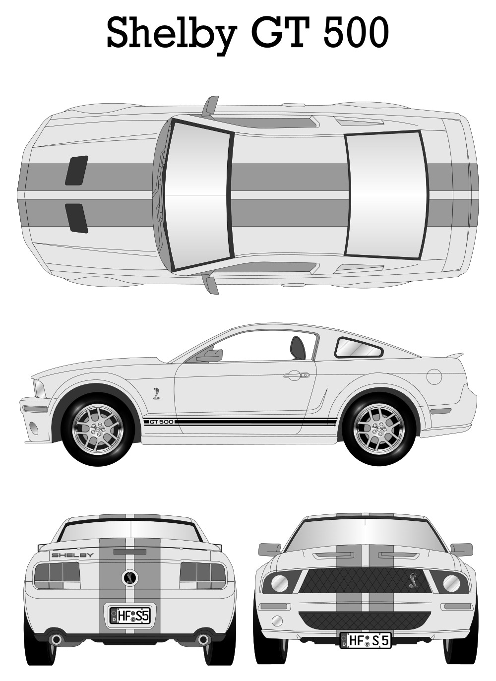 Shelby GT 500 Car Blueprint PDF SVG Vector Drawing.