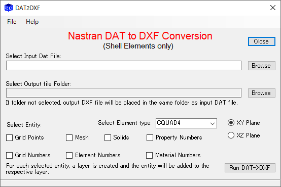 Using this simple but powerful desktop app, one can convert Nastran DAT file into DXF with different features, like choice of elements and layers, etc...