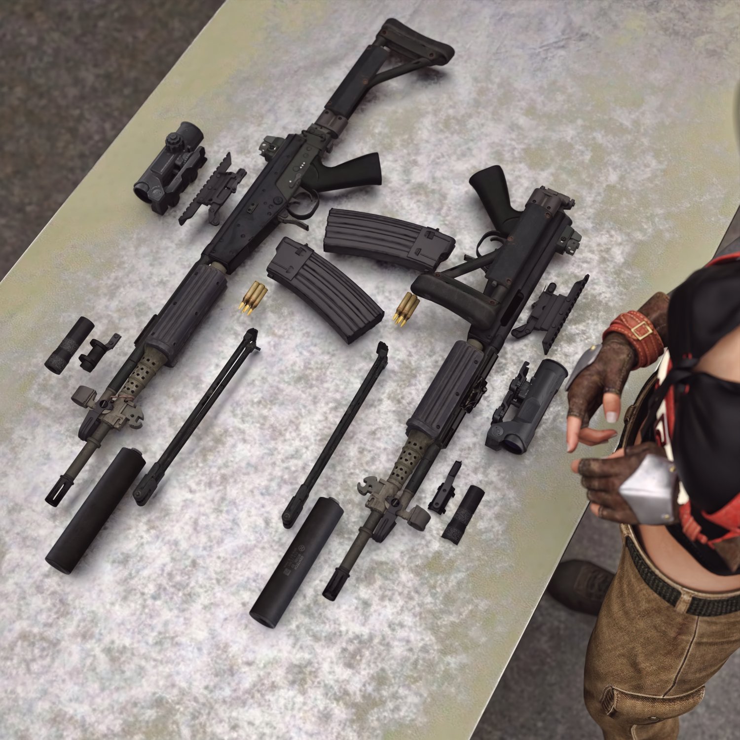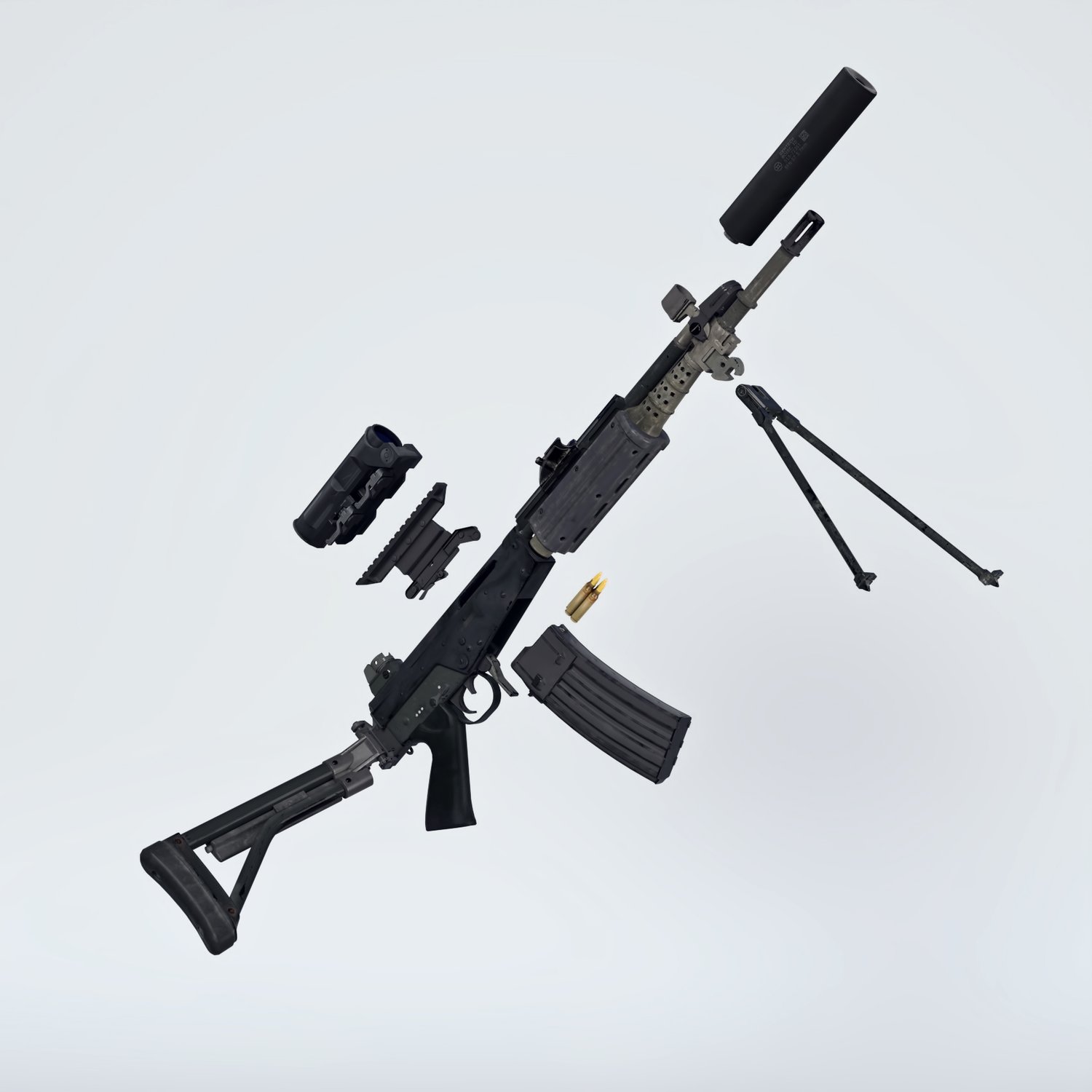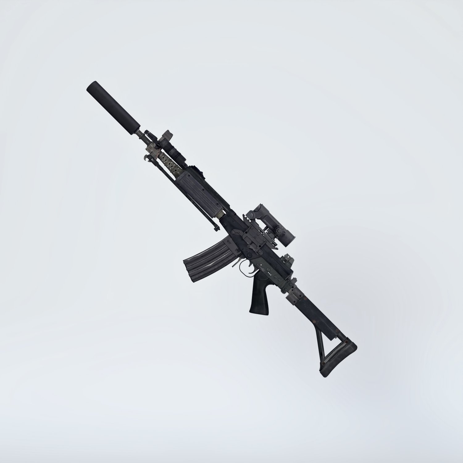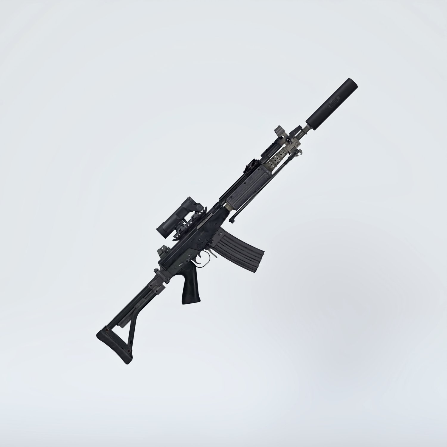 A slightly modernized Argentinian assault rifle. Inspired by various pretty obvious rifles of that time, it came out a rifle of itself. Not super popular, but great looking gun. Comes with some attachments for customization. Converted and rigged for use with DAZ. Trigger, safety, bolt etc also rigged for more realistic pictures. Includes a silencer, bipod, optics and optics mount, for various porpoises and pictures.