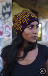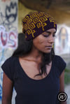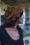 Shown in Dragonfly Fibers Traveller DK in shades ‘Heroine’ & ‘Golden Compass’ [280yd/256m per 4oz/114g; 100% Superwash Merino]Shown in size 20in/50.75cm on model with 21in/53.25cm circumference head