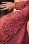 Esta camisola é tricotada de cima para baixo, em circular e sem costuras. Começamos por tricotar a gola e todo o encaixe com aumentos e o ponto rendado. Nas cavas as malhas das mangas são deixadas em espera enquanto tricota o corpo em circular. No final, retomamos as malhas das mangas e tricotamos em circular até ao punho. O ponto rendado está descrito em gráfico e em instruções escritas.