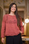 Este jersey está tejido de arriba hacia abajo en circular y sin costuras. Empezamos tejiendo el canesú con aumentos y el punto calado. En las sisas se dejan en espera los puntos de las mangas mientras se teje el cuerpo en circular. Al final, retomamos los puntos de las mangas y tejemos en circular hasta el puño. El patrón de punto calado se describe en un gráfico y en instrucciones escritas.
