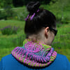 Fourth up, Autumn Come mingles the last days of summer with thoughts of cold evenings to come. A moebius cast on joins forces with brioche to create a uniquely intriguing mirrored abstract leaf and branch pattern. Adventurous knitters will delight in the stitch interest created by combining these techniques. Use bright colors to hold fast to the last vestiges of summer or deep tones to welcome Autumn with your stitches. Notes on Autumn Come - Skills & Construction: moebius, brioche, brioche shaping stitches. As any adventurous knitter knows, each pattern is conquered one stitch at a time. Autumn Come is no different! Traditionally speaking, this would fall in the advanced skill category. Test knitters who had not used either technique before proudly accomplished this pattern! With determination, patience, and concentration you too can impress your friends with your finished Autumn Come.