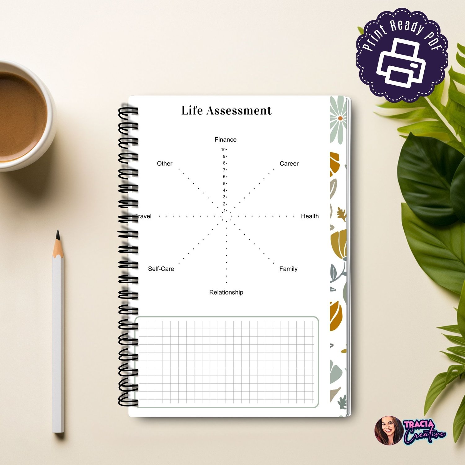 Unlock the potential of your life with the Life Assessment Tracker, designed specifically for professionals, adults, and entrepreneurs who are on a journey to enhance every aspect of their lives. This beautifully crafted planner insert, adorned with a floral design, offers a comprehensive two-page spread that covers key areas such as finance, career, health, family, travel, and self-care. Available in A5 size and as an instant PDF download, this tool is perfect for those looking to deeply assess and improve their life's dimensions. With the Life Assessment Tracker, you can set clear goals, track progress, and make informed decisions to lead a more balanced and fulfilling life.