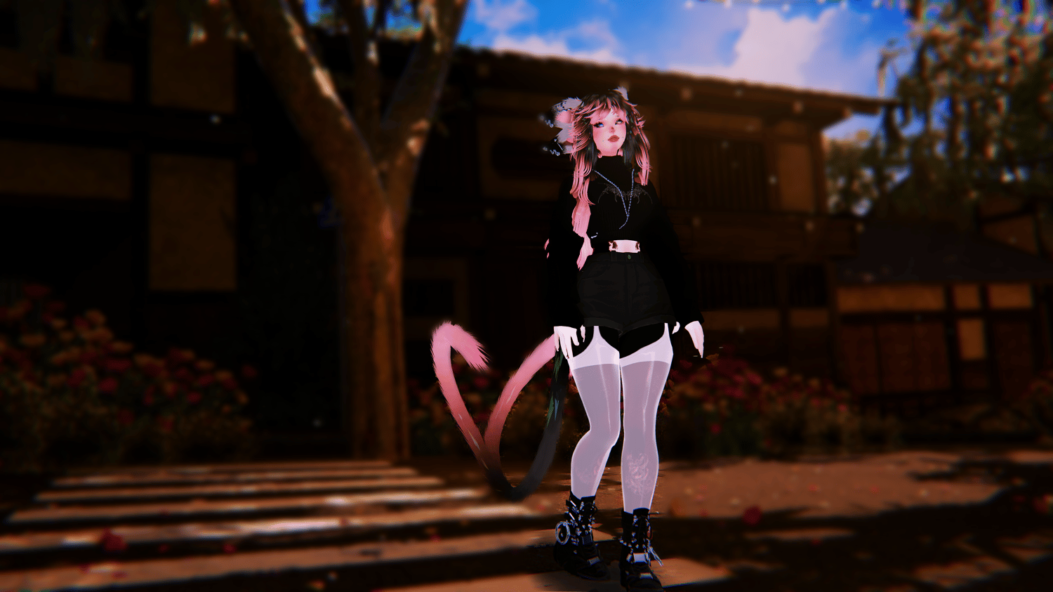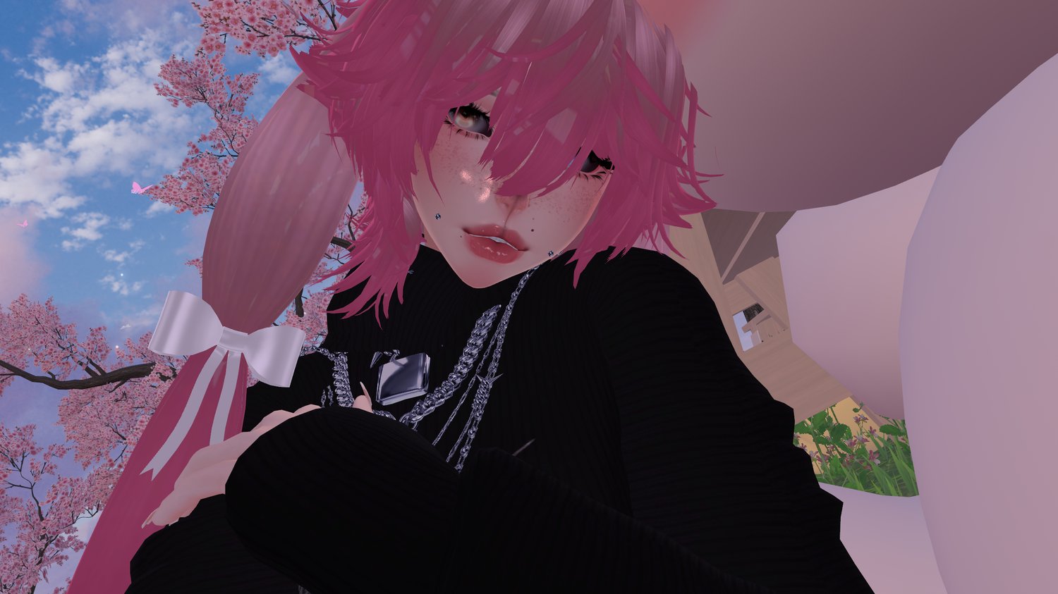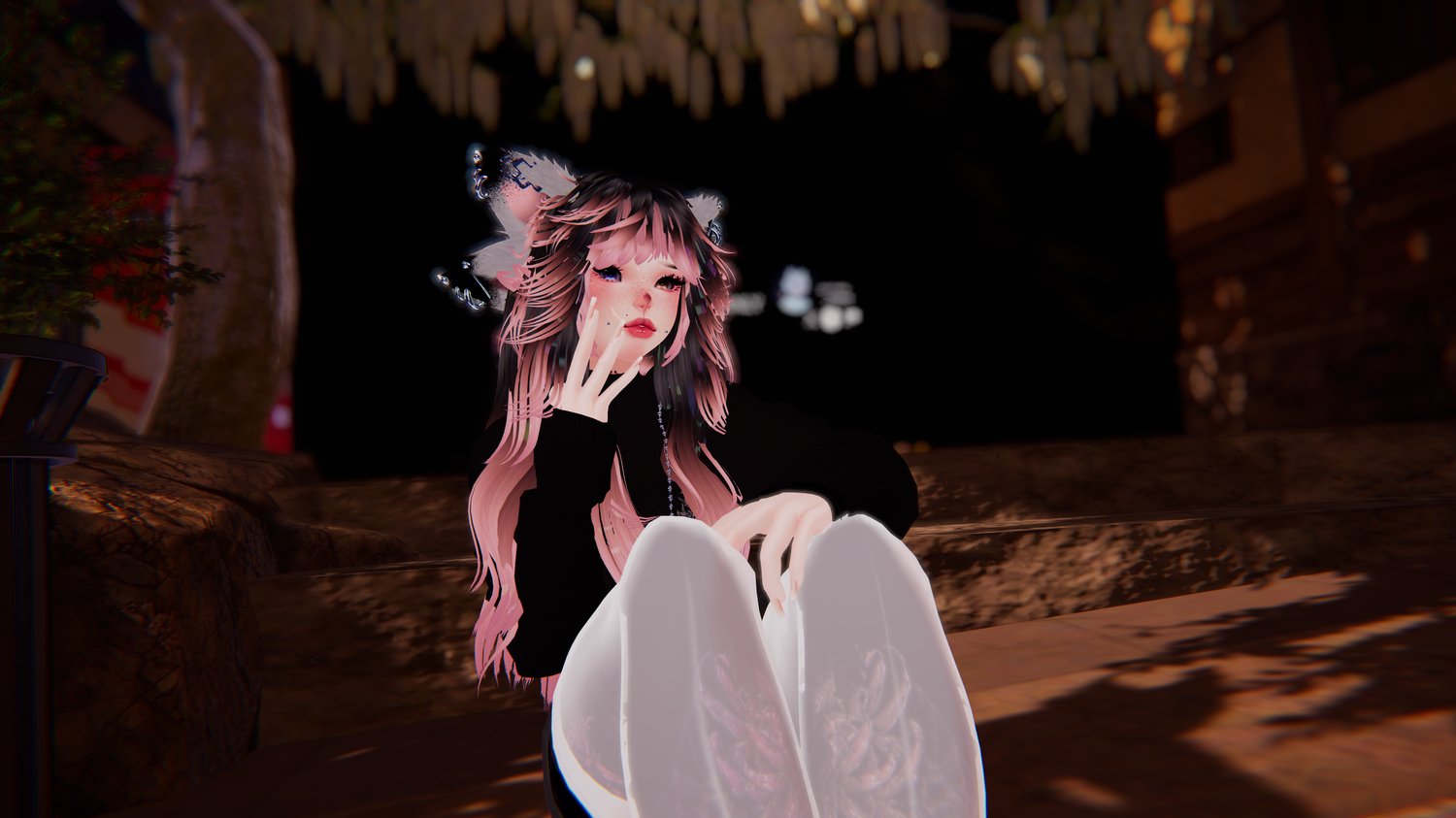 Accessories (Stockings by AdamEve桜, Harness by TheThiccWitch (NO LONGER AVAILABLE), Body Ribbons (NO LONGER AVAILABLE), Warmers by Syyanide, and Choker by LeXXXya.)