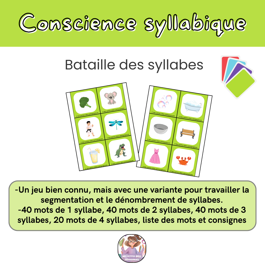 Vous retrouverez : 40 mots de 1 syllabe, 40 mots de 2 syllabes, 40 mots de 3 syllabes, 20 mots de 4 syllabes, la liste des mots ainsi que les consignes pour diverses idées d’utilisations.