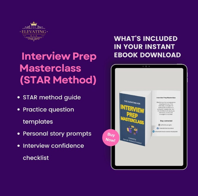 Step into every interview with confidence and clarity using the Interview Prep Masterclass, a powerful digital eBook developed by The Elevating Her. This guide is tailored especially for women of color, emerging leaders, and driven professionals navigating interviews across career, leadership, and entrepreneurial spaces.