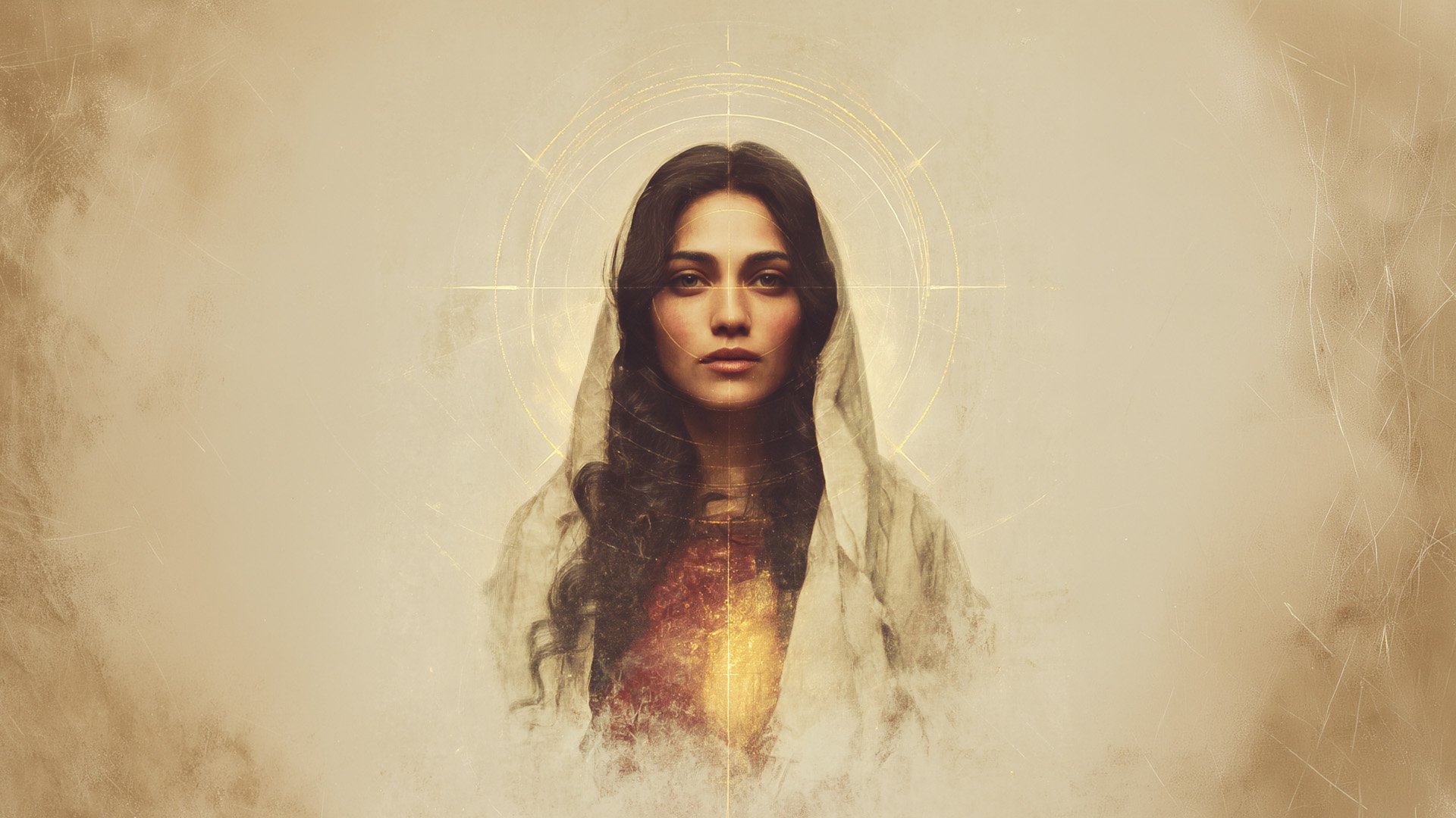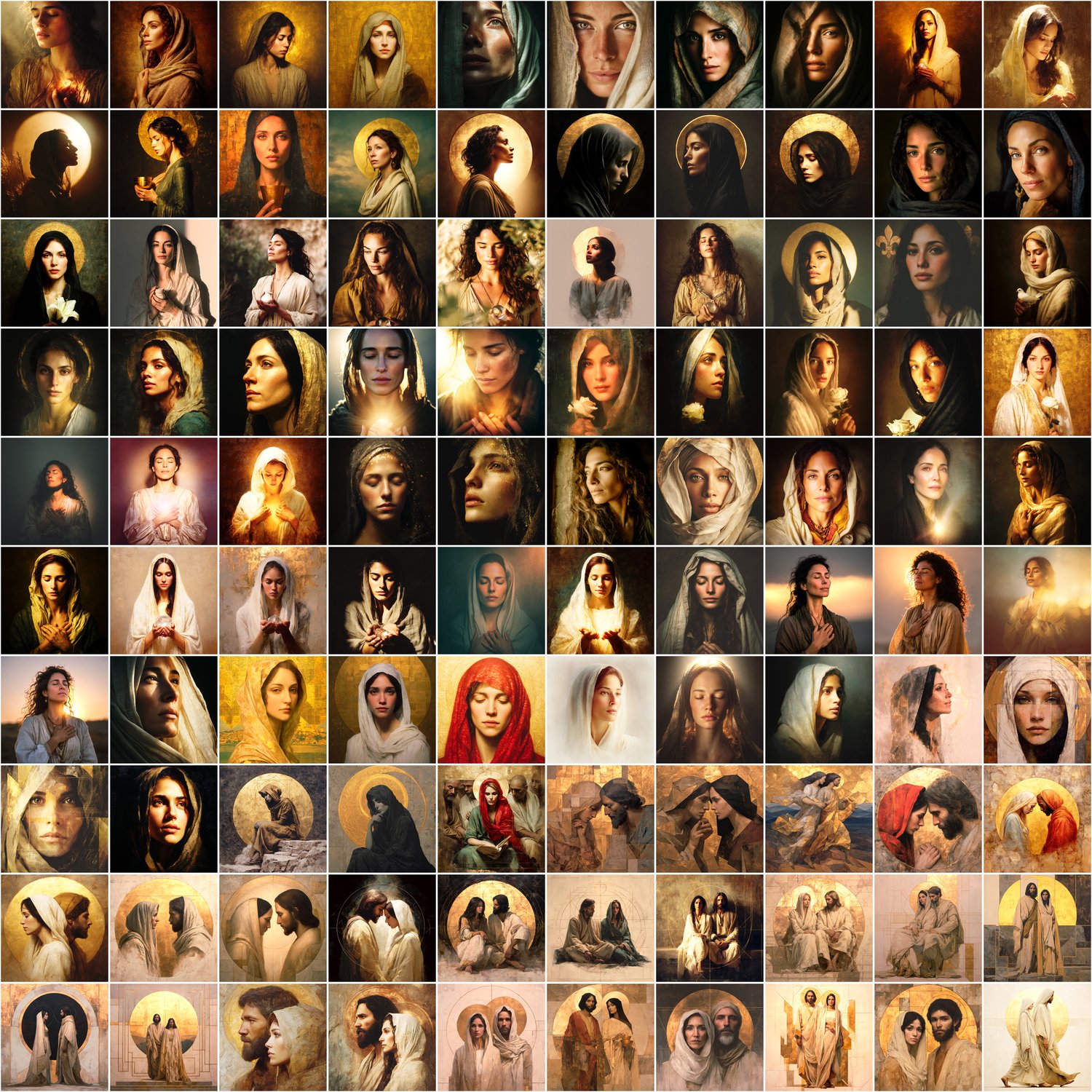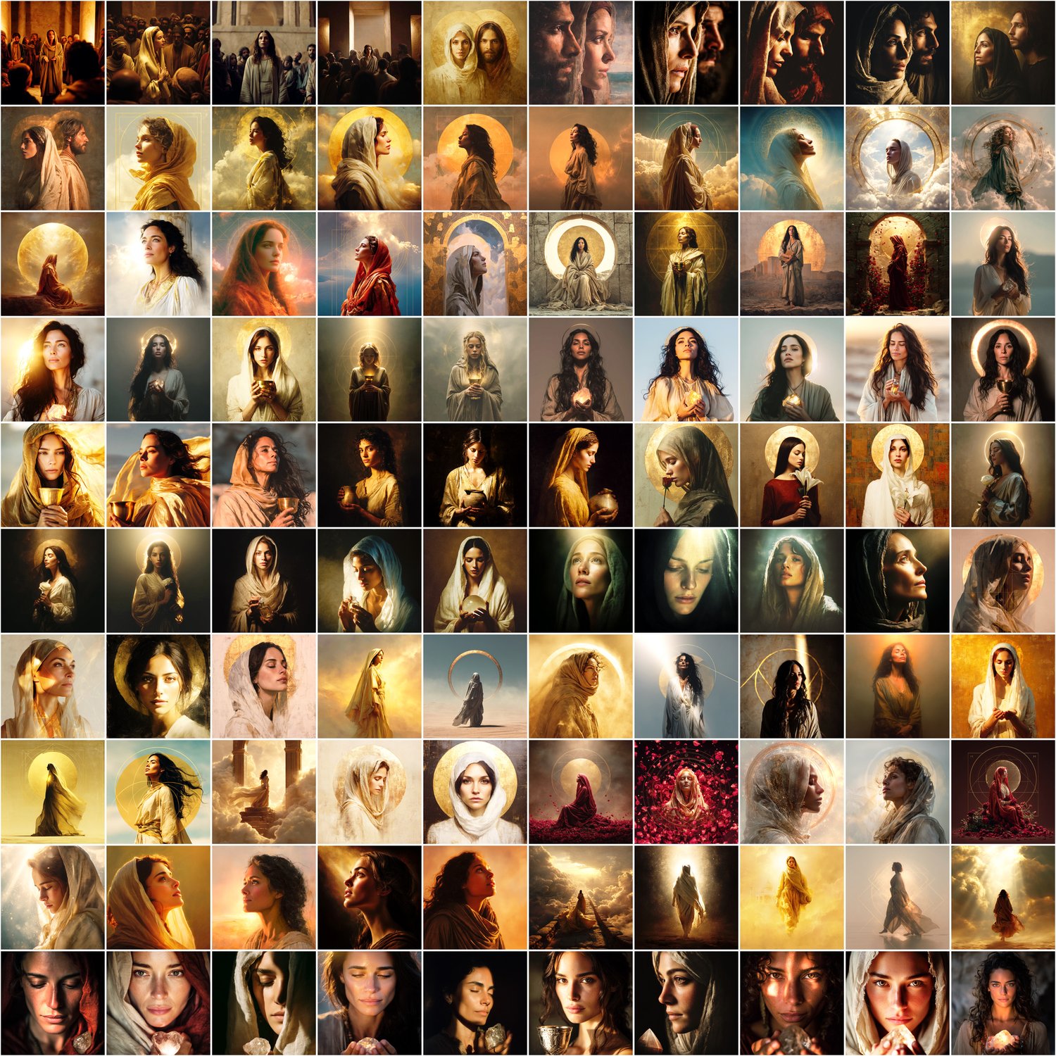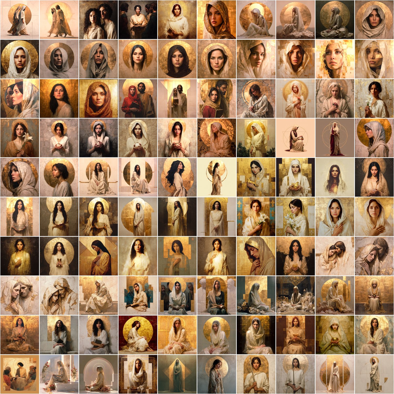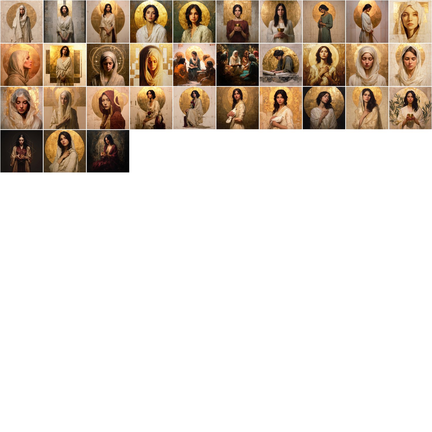 calm expressions, mediterranean features, refined gold elements, subtle symbolism, and a contemporary sacred aesthetic.