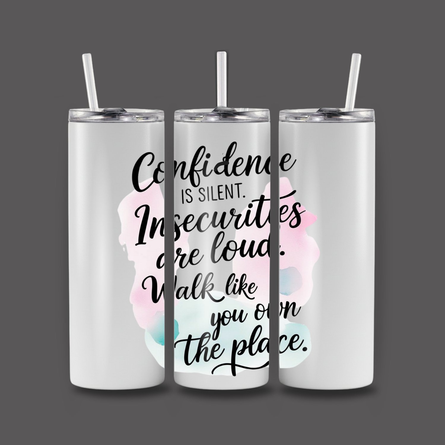 Carry confidence with you. This 20 oz stainless steel skinny tumbler features a soft watercolor design with a bold reminder to move with quiet strength and unwavering self-assurance. The message encourages you to stay grounded, trust yourself, and walk like you own the place.
