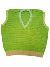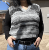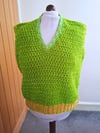 This is a PDF crochet pattern for a sleeveless V-neck vest, worked in rows and finished with minimal seaming.