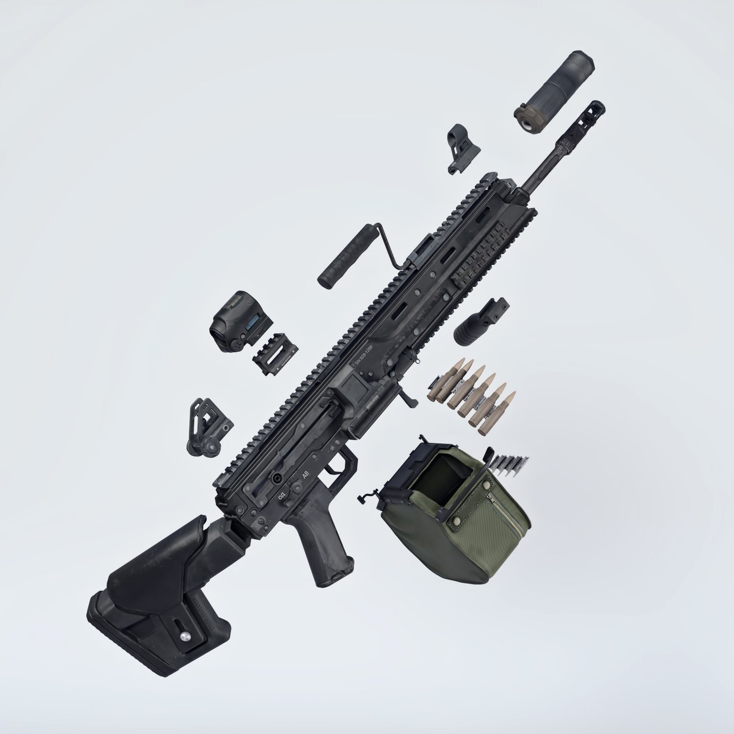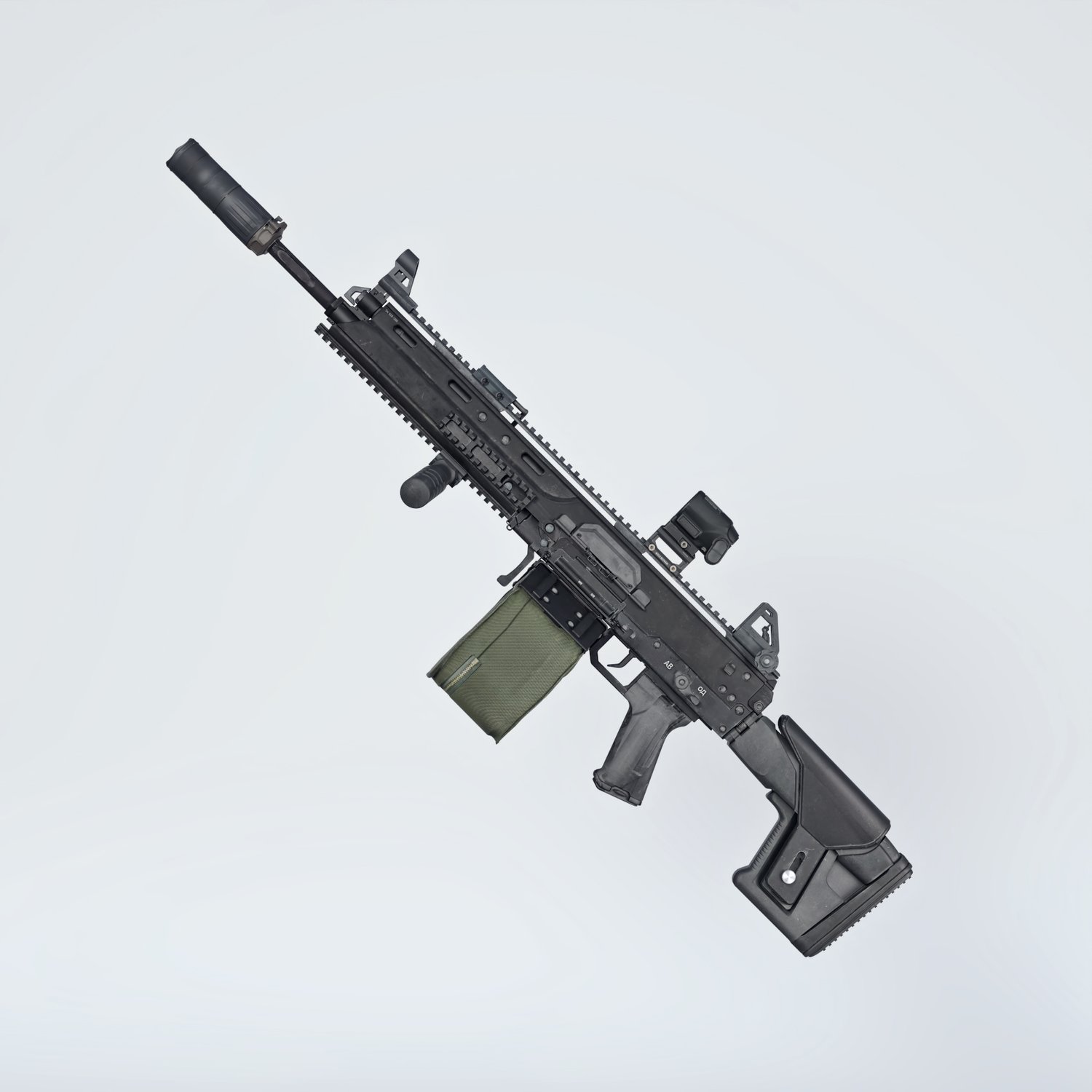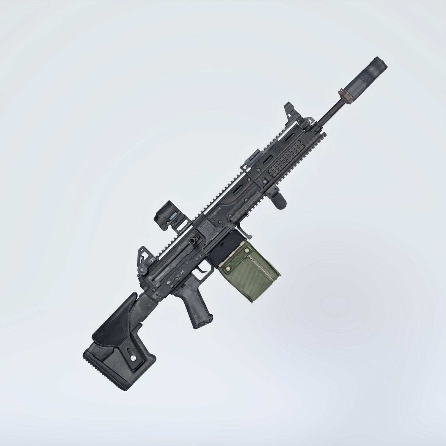 The gun is based on the RPL 20 machinegun, rigged and converted for use with DAZ. A new Russian development in the light machine gun field, finally something not AK based (though designed by Kalashnikov concern). Trigger, safety, bolt, etc also rigged for more realistic pictures. Includes some attachments for various porpoises and pictures, like a red dot sight, silencer, front grip, carry handle and some rails.