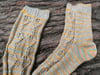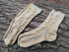 As temperatures decrease, trees change colour and shed their leaves. The falling leaves served as inspiration for this pattern. These top-down socks feature a twisted rib cuff, an elegant lace pattern resembling falling leaves, a short-row heel and a rounded toe. These socks will be the perfect companions for sunny autumn days.