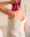 The cami is knit from the top down, so it is easy to pick a perfect desired length. This pattern can be worked in any number of colors from one (let those textures reign!) to as many as you have. It is perfect for using up leftover yarn or mini skeins.