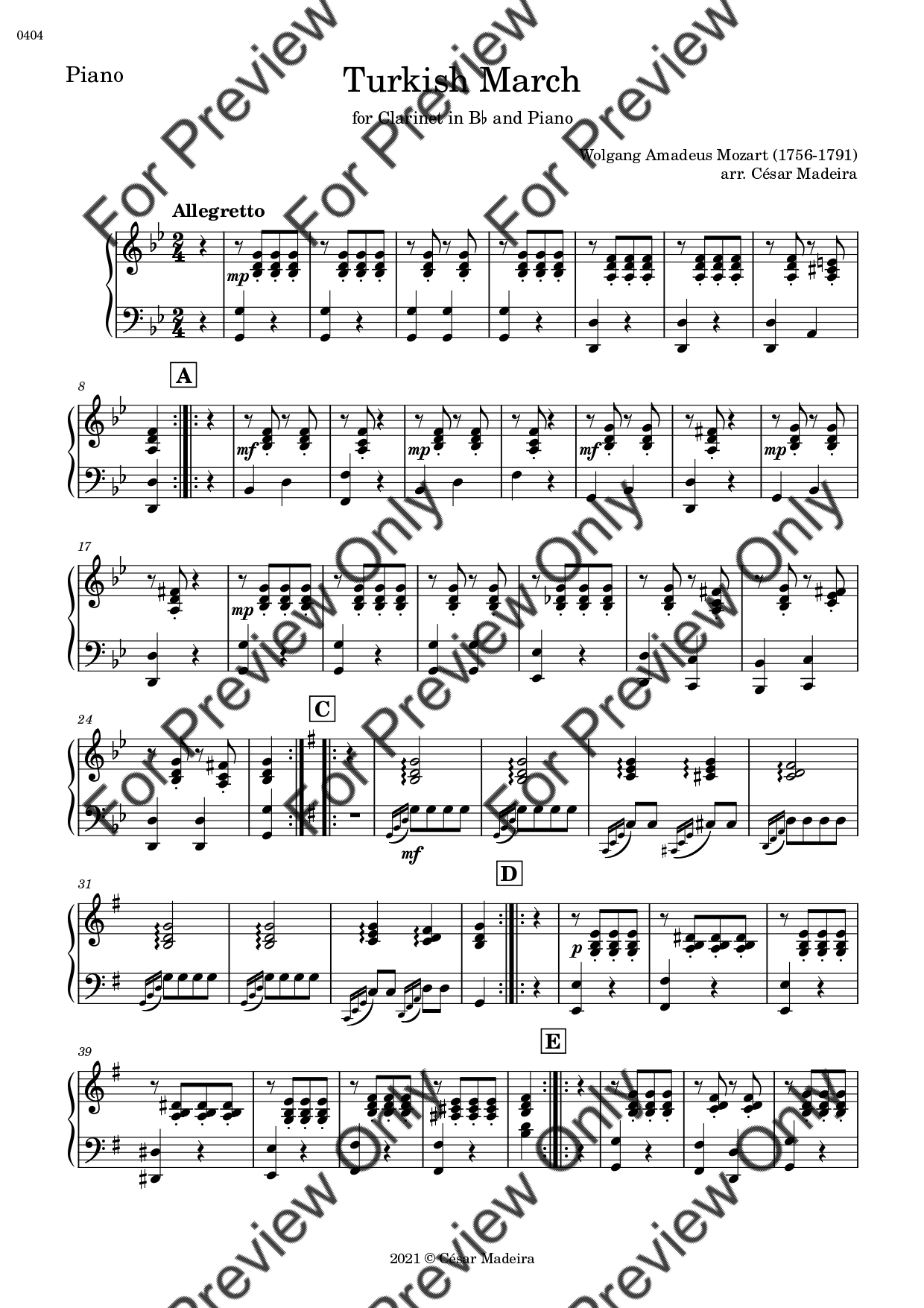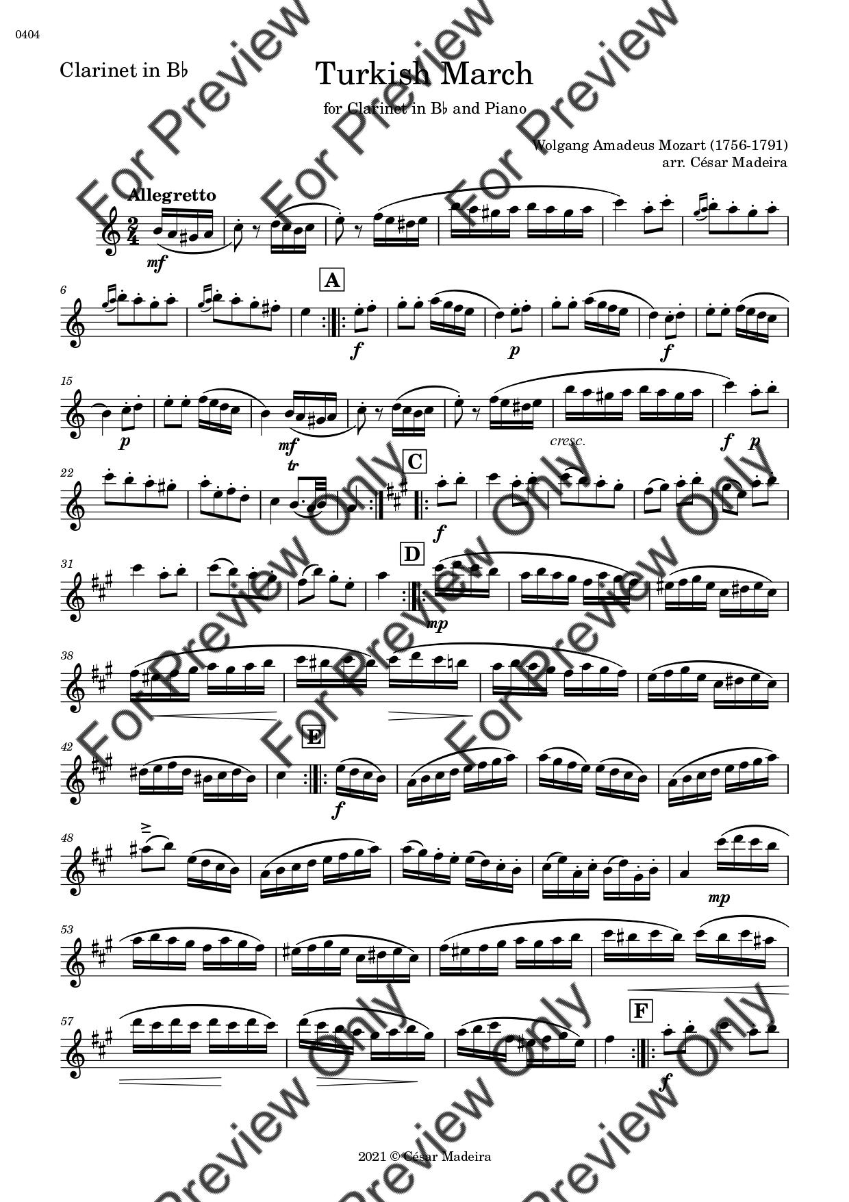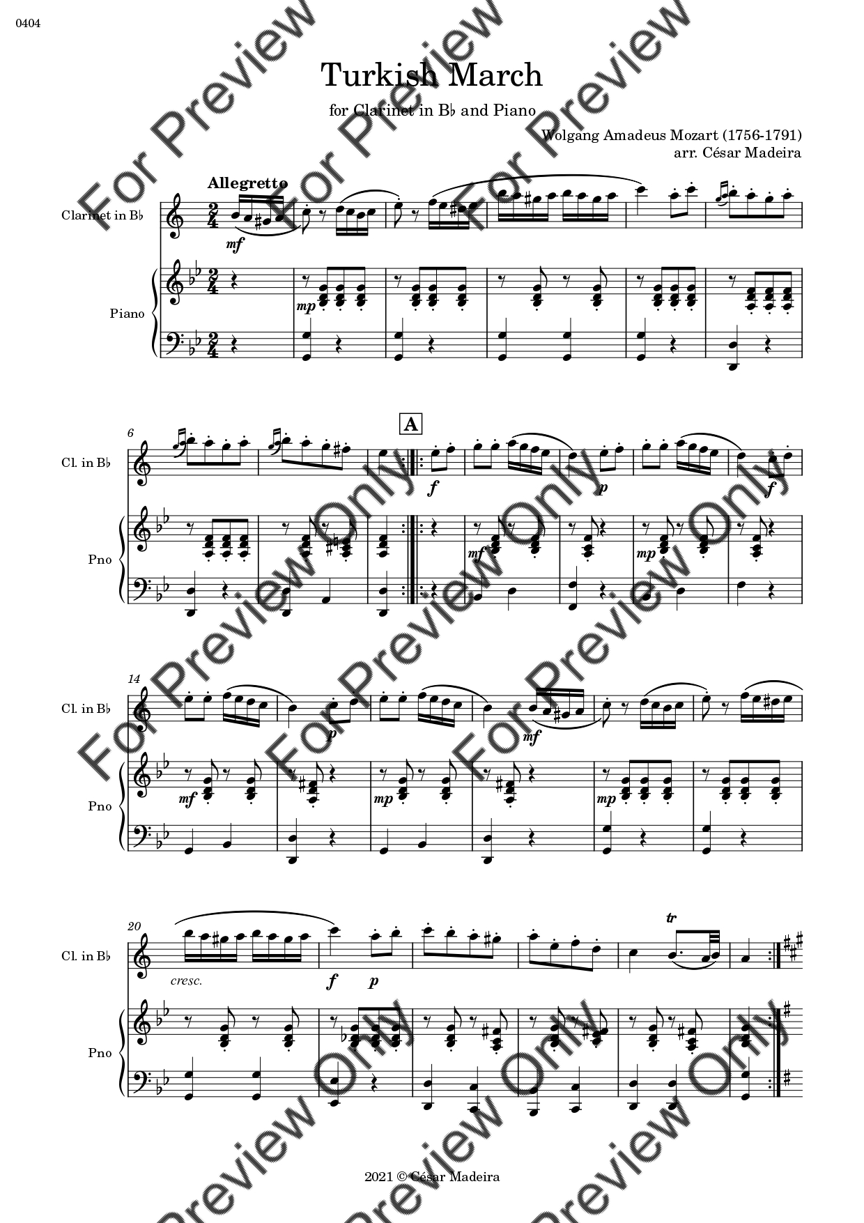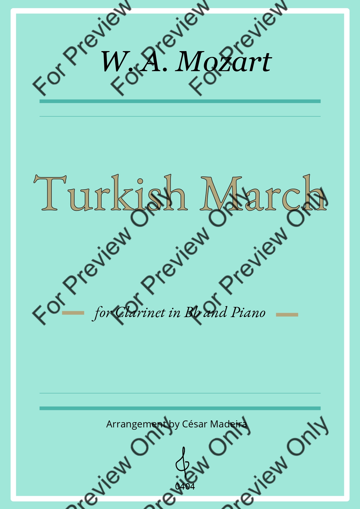 Turkish March by Wolfgang Amadeus Mozart. Arrangement for Bb Clarinet and Piano. With Full Score and Individual Parts. Have fun!