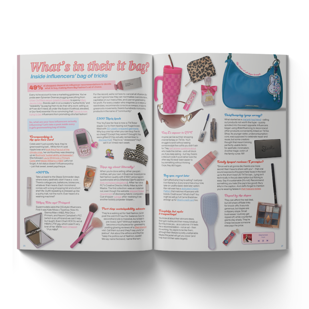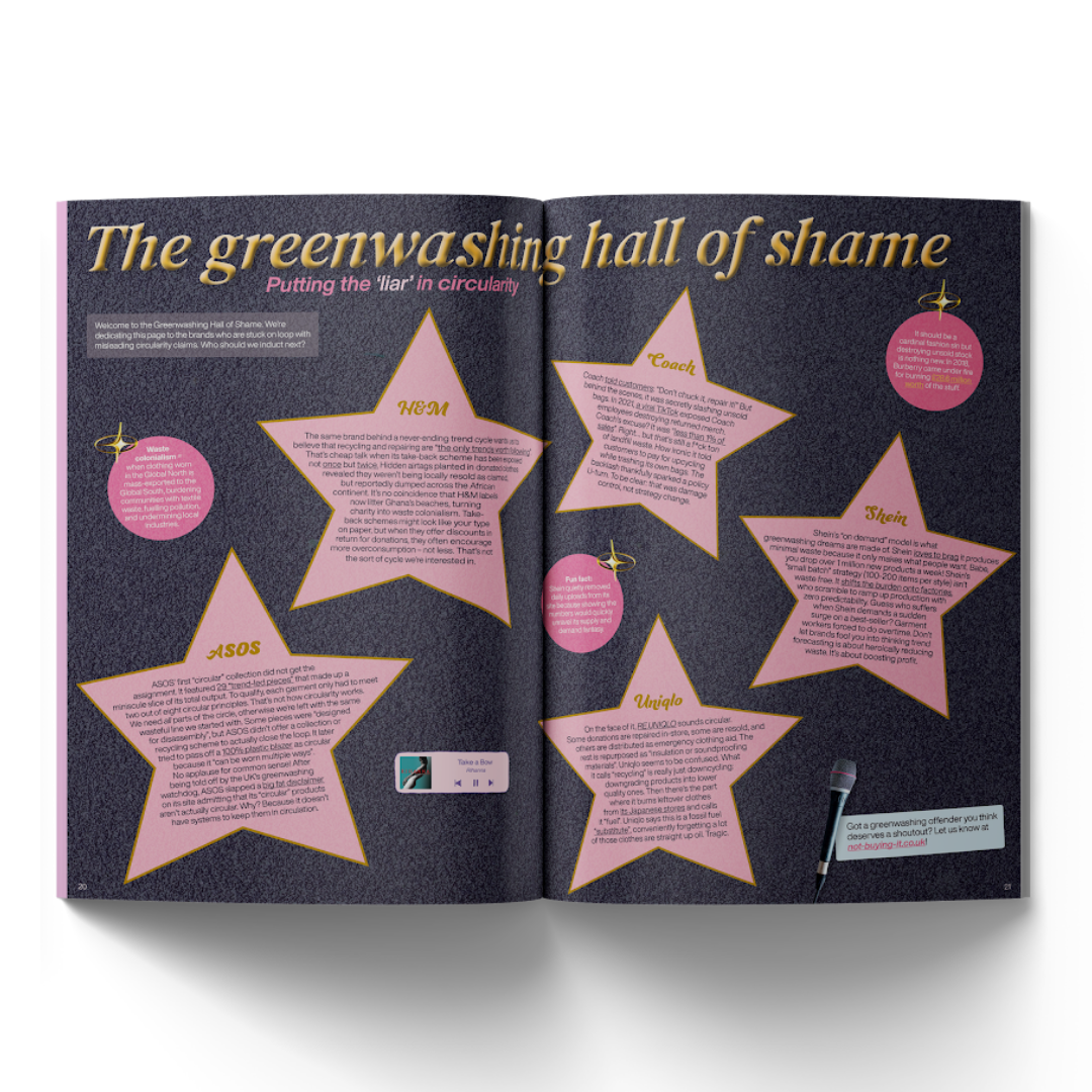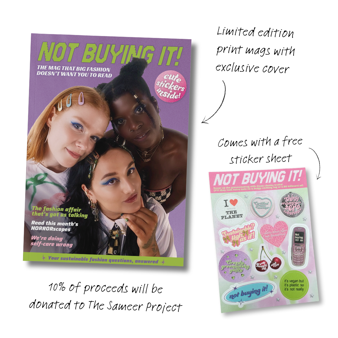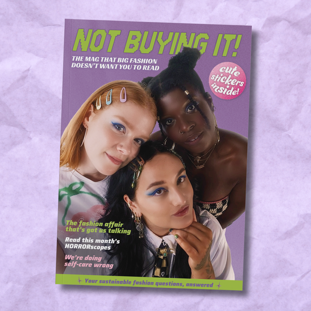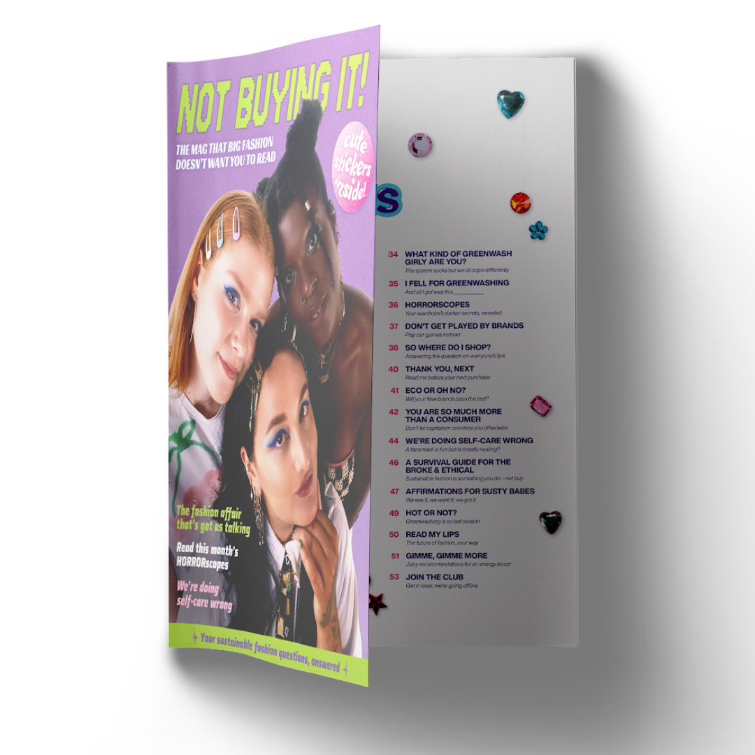 Not Buying It reimagines the mags of our girlhood to expose fashion’s shady practices. It’s got everything you’d expect: flaky exes, smoking hot affairs, horror-scopes, an agony aunt, quizzes, and more! Get ready for some Oh Major Greenwashing (OMG) moments, and discover how we can show up and take action Elle Woods-style 💅